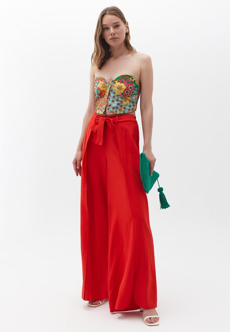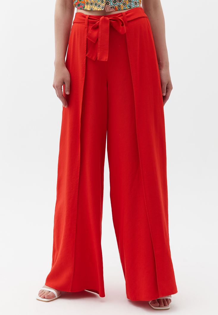 • Bayan Kırmızı Yırtmaç Detaylı Wide-Leg Pantolon