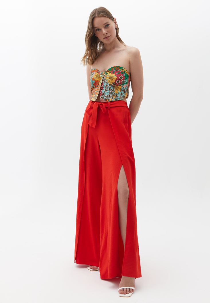 Kırmızı Yırtmaç Detaylı Wide-Leg Pantolon