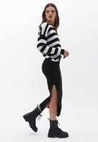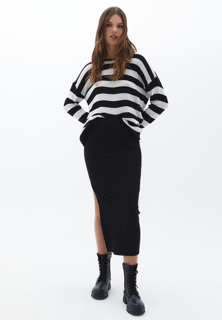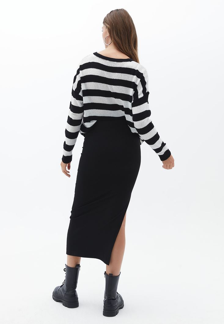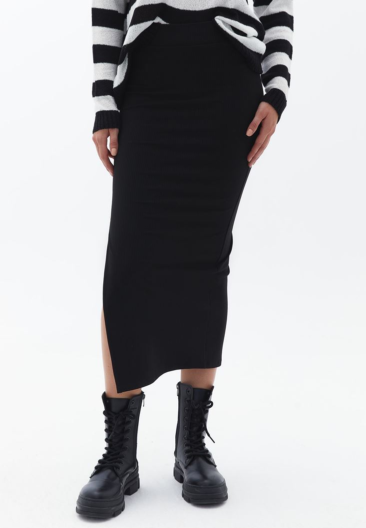 Viskon karışımlı özel doku, yan kısmı yırtmaçlı, bedeni saran fit, yüksek bel, maxi boy, beli lastikli.