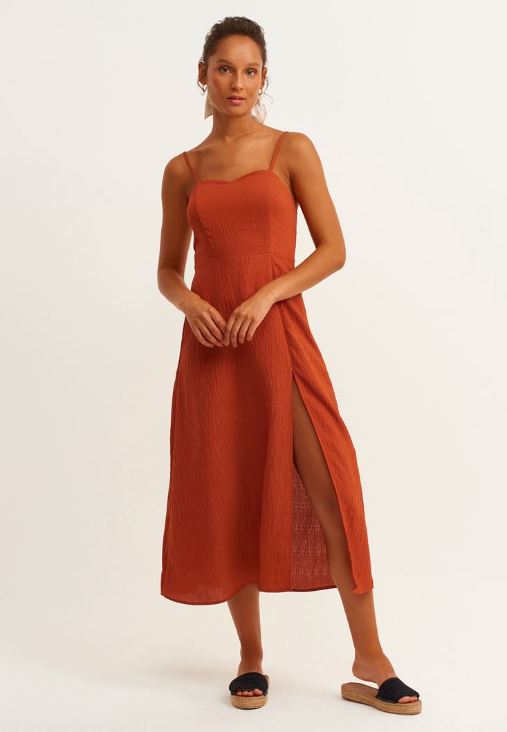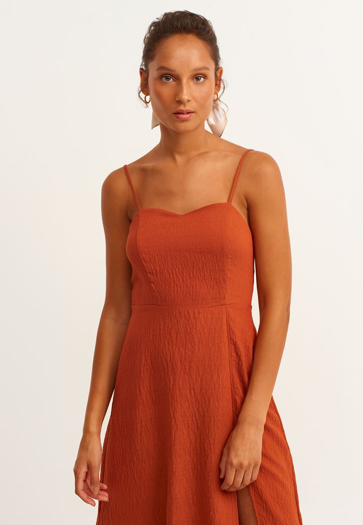 • Bayan Kiremit Yırtmaçlı Maxi Boy Elbise