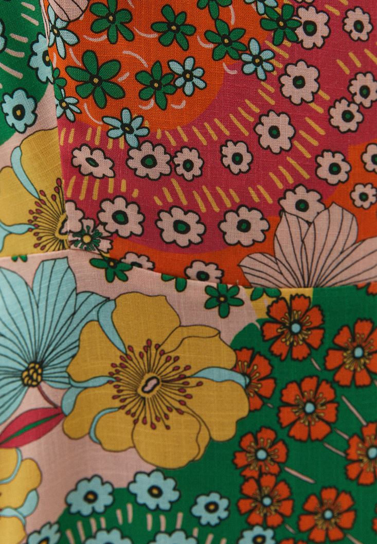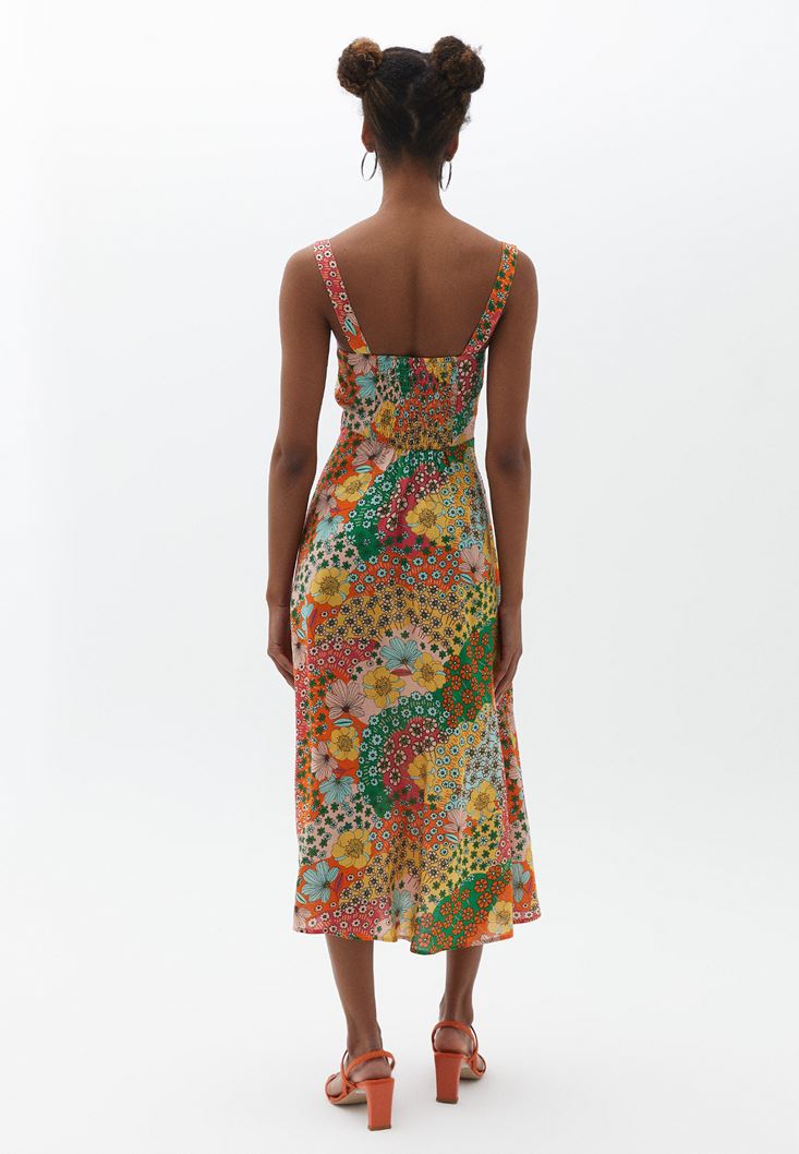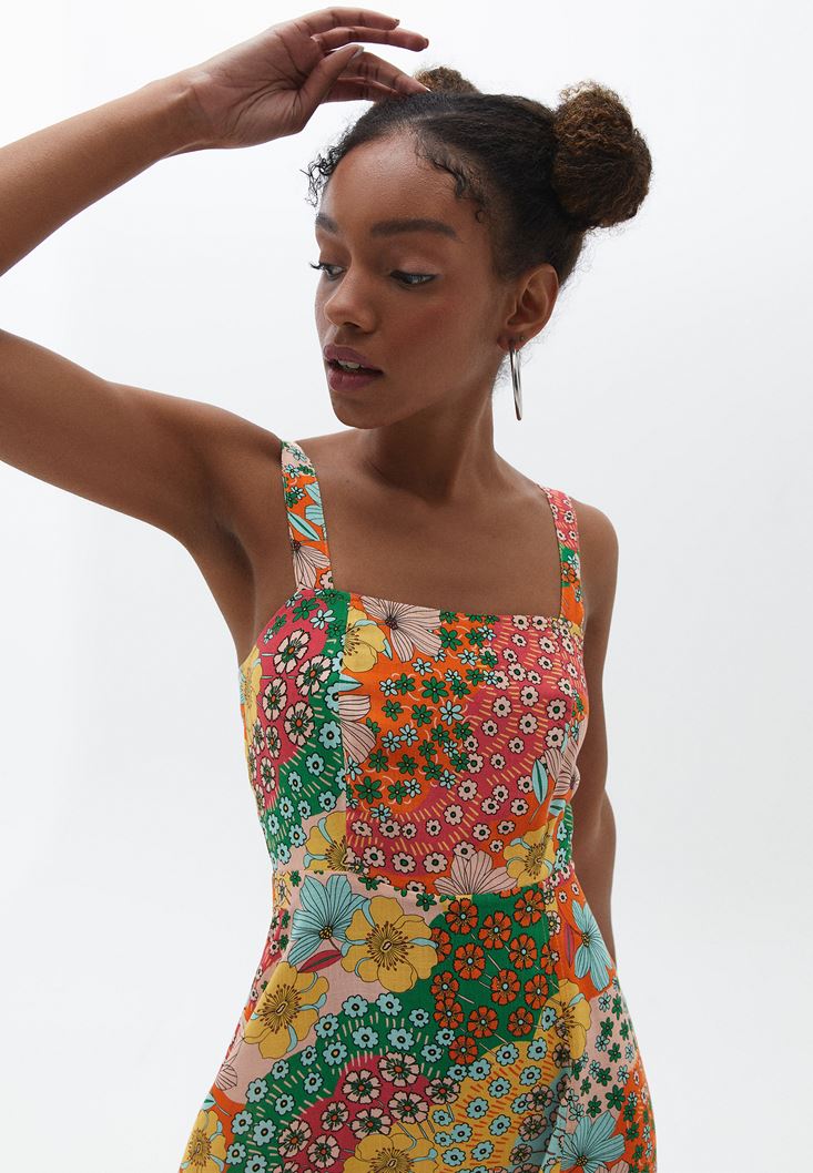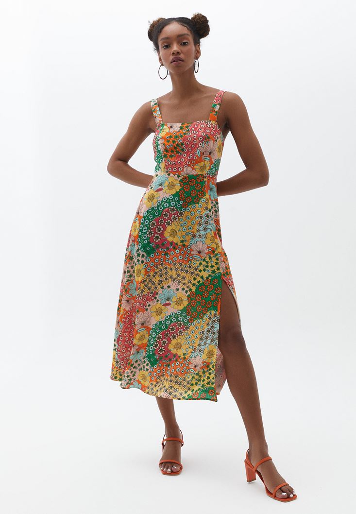 %100 viskon içerikli doku, çiçek desenli, kare yaka, a kesim, kalın askılı, sırt kısmı gipeli, midi boy, ön kısmı tek yırtmaçlı.