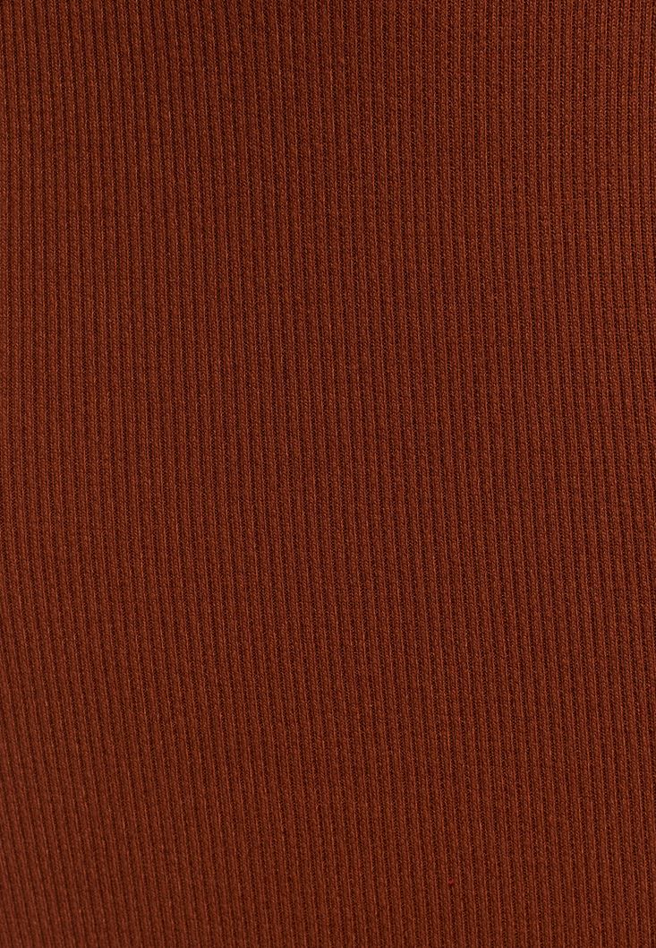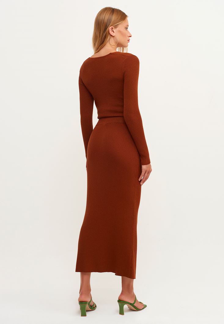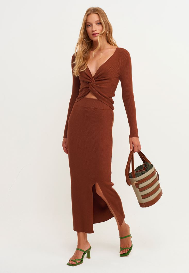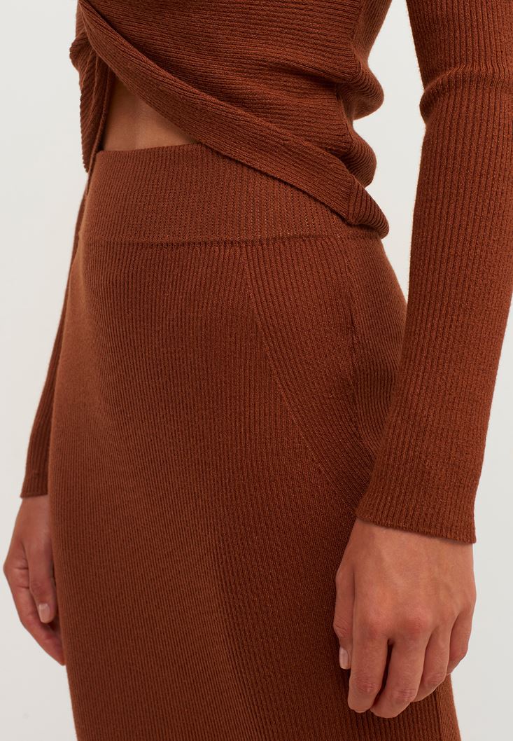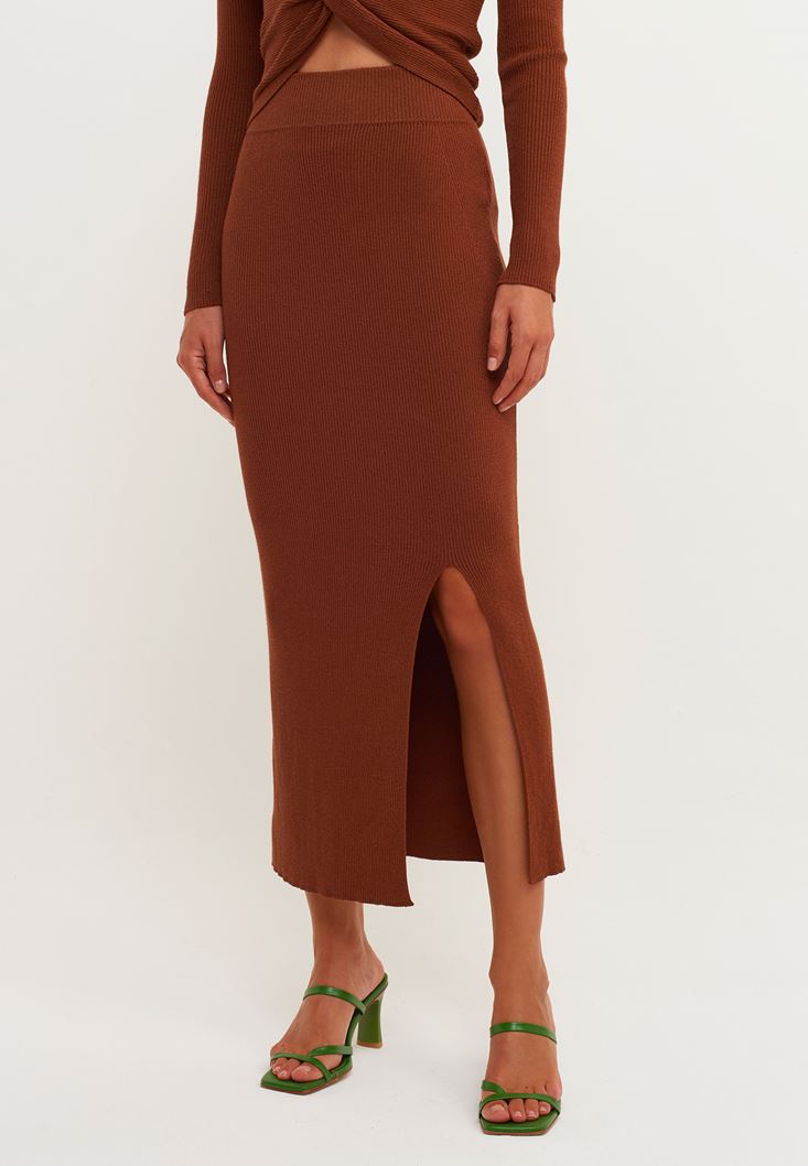 Kahverengi Yırtmaçlı Midi Boy Triko Etek