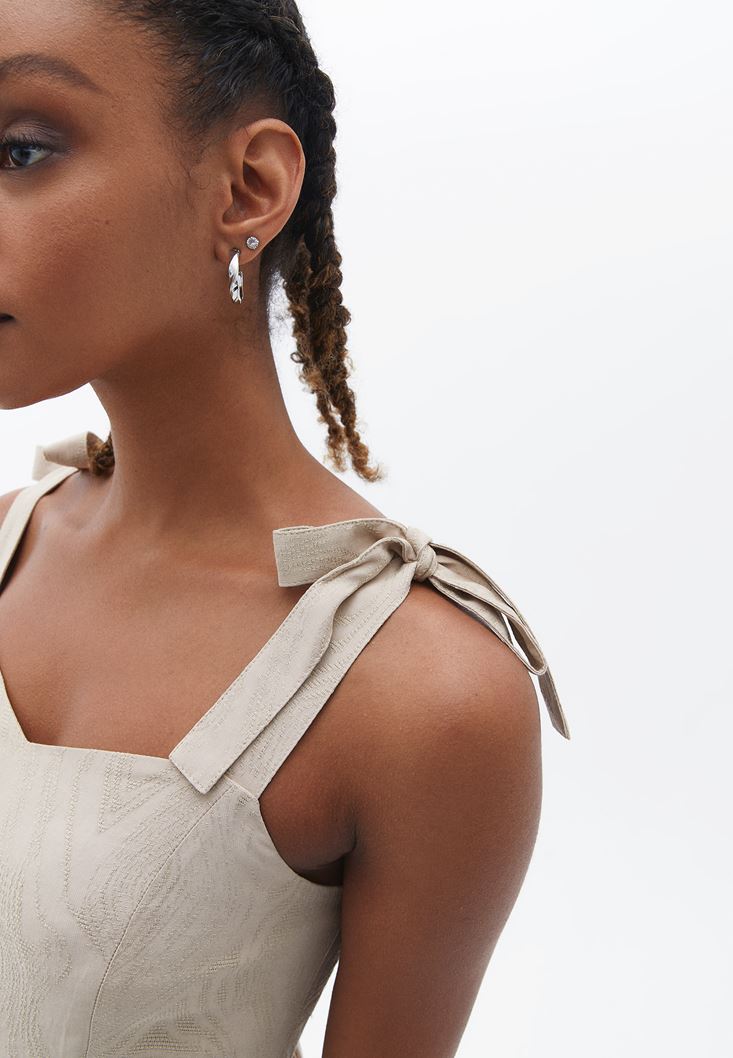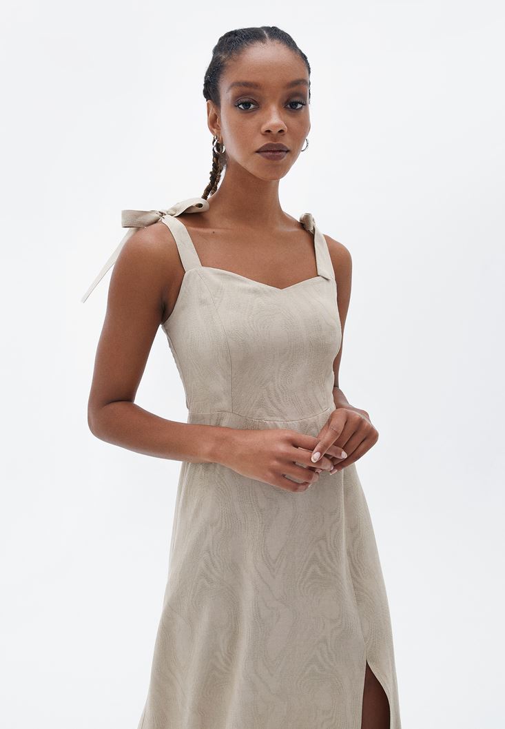 Viskon içerikli jakarlı doku, kalp yaka, bağcık detaylı kalın askı, ön kısmı yırtmaçlı, midi boy, sırt kısmı esnek gipeli, a kesim etek.