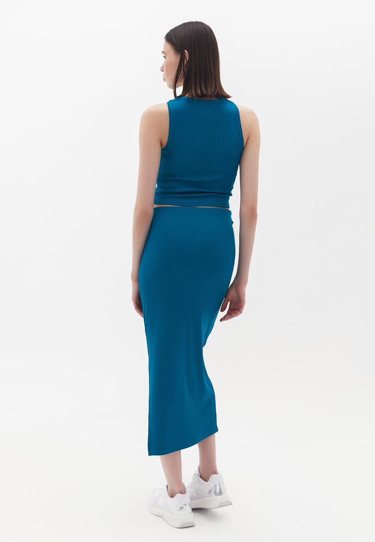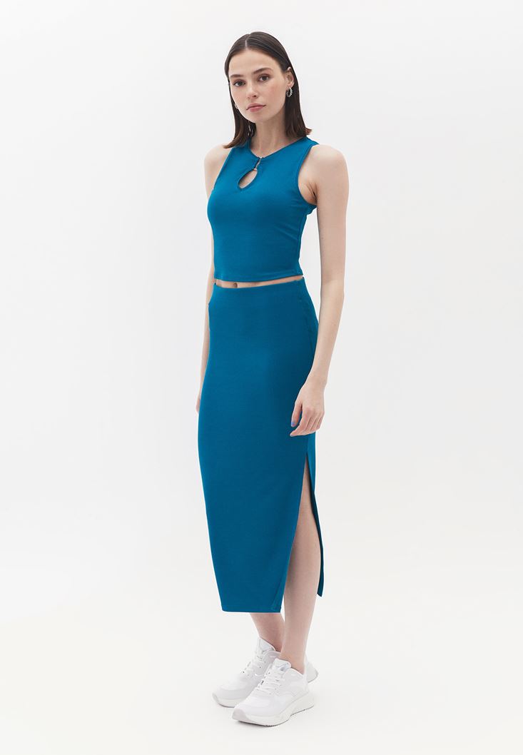 • Bayan Mavi Yırtmaçlı Midi Etek