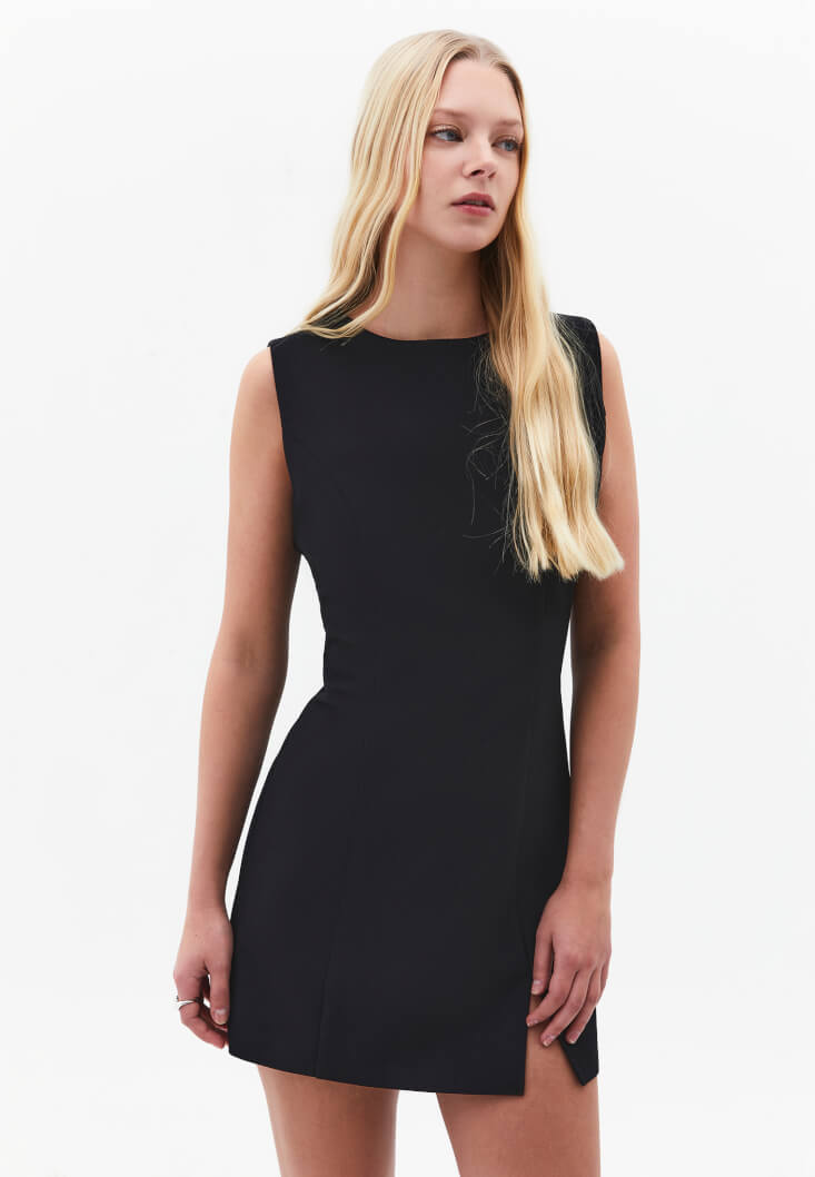 • Bayan Siyah Yırtmaçlı Mini Elbise