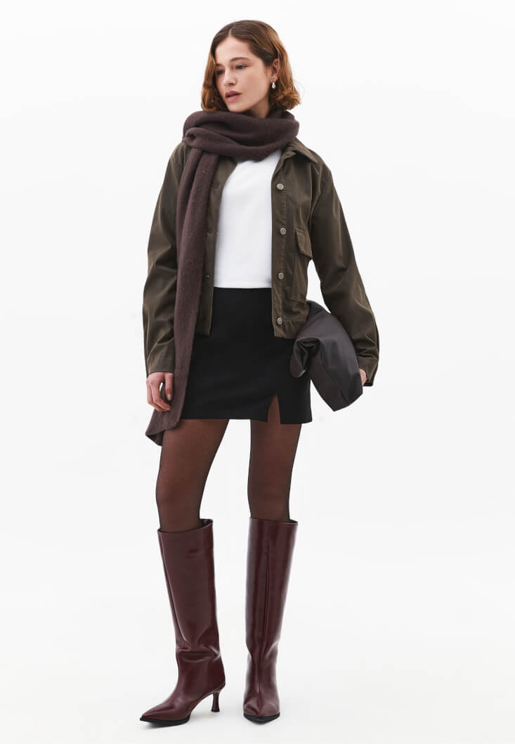 Şehirli ve şık bir görünüm için cep detaylı ceketler ve topuklu uzun çizmelerle kombinleyebilir; içine ekleyeceğiniz sıfır yaka oversize tişörtlerle çabasız bir stil görünümü yakalayabilirsiniz. Askılı tote çantalar, halka küpeler ve yumuşak dokulu ince şallarla stilinizi tamamlayarak detaylarda fark yaratın. Hem yoğun şehir temposunda hem de keyifli buluşmalarda fark yaratan bir silüet için bu yırtmaçlı mini etek ideal bir seçim.