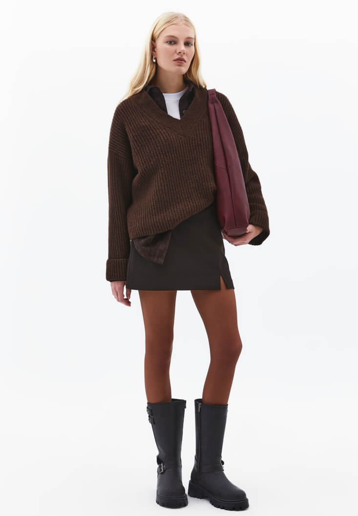 • Bayan Kahverengi Yırtmaçlı Mini Şort Etek