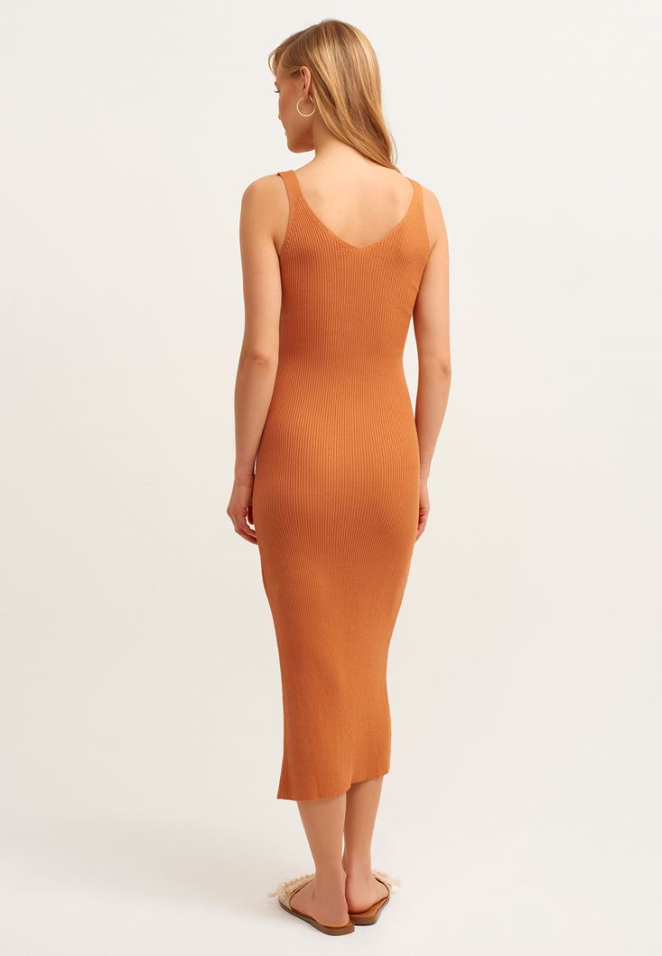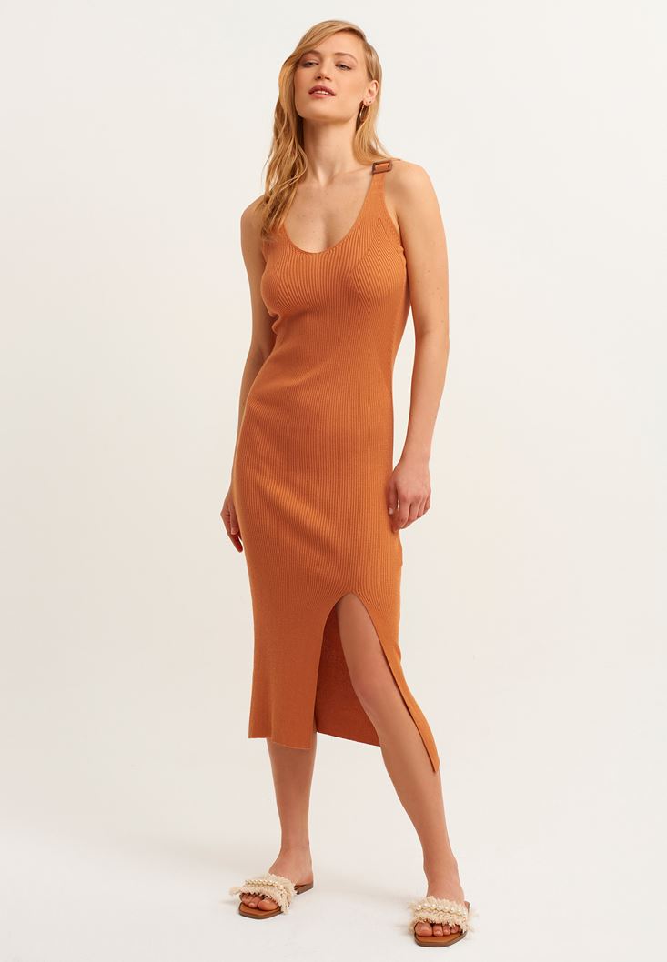 • Bayan Turuncu Yırtmaçlı Uzun Triko Elbise