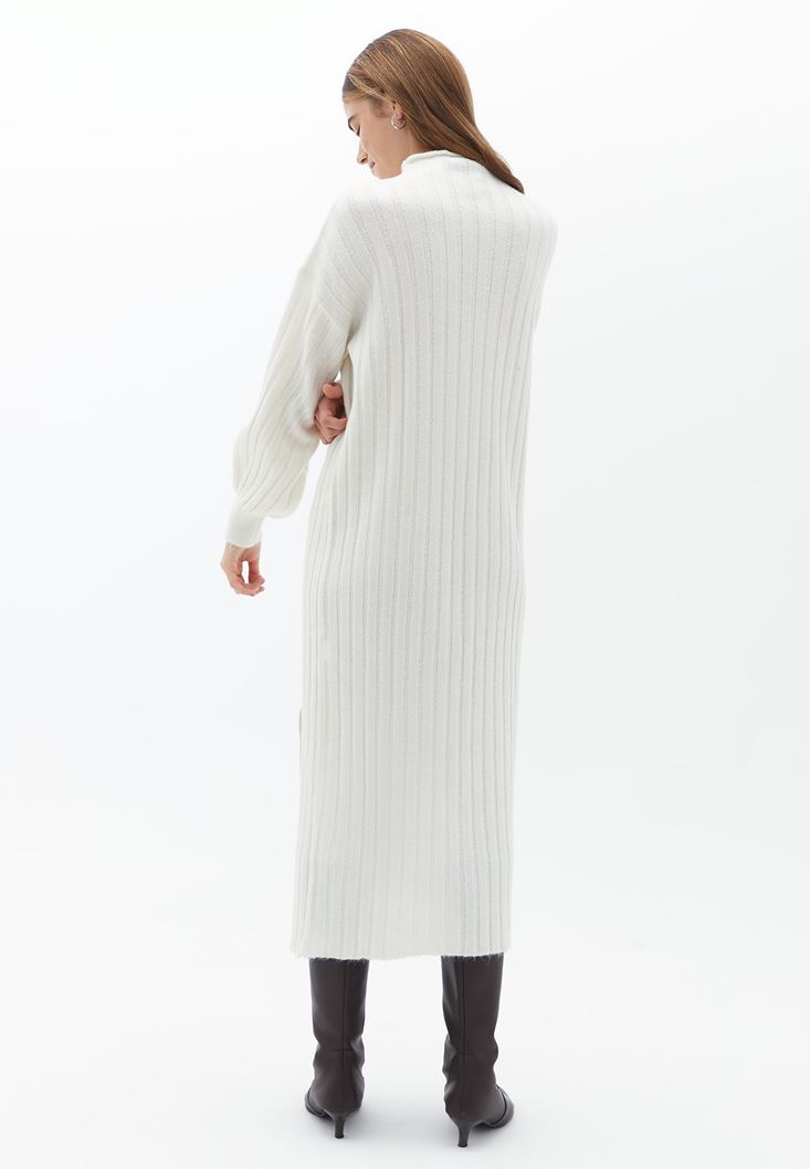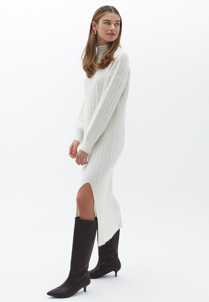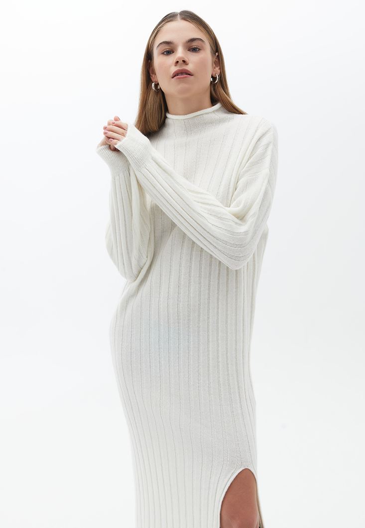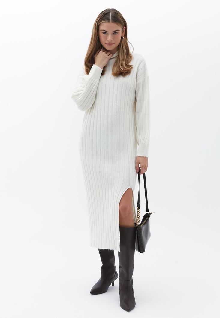 Krem Yırtmaçlı Uzun Triko Elbise