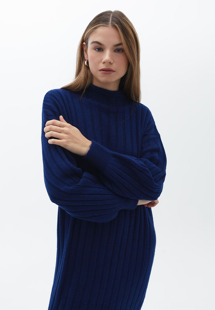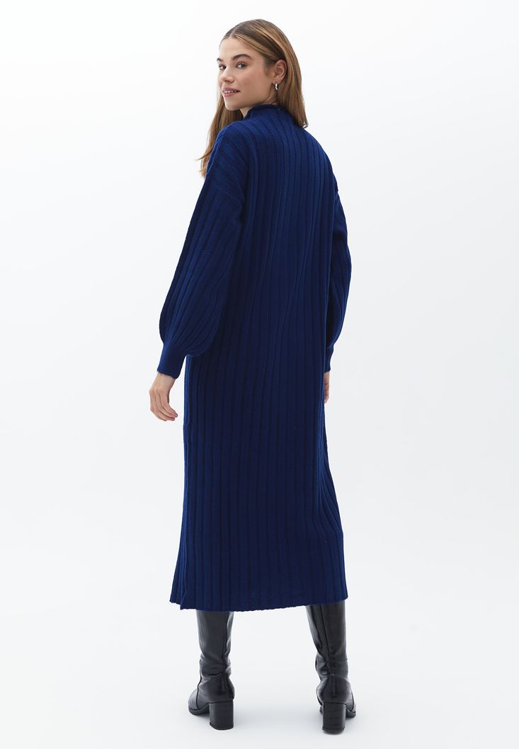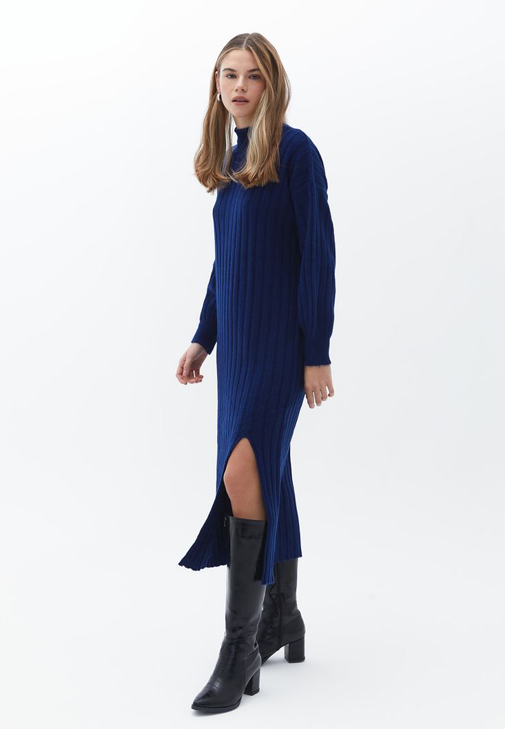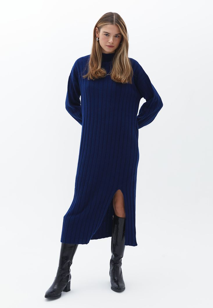 Mavi Yırtmaçlı Uzun Triko Elbise