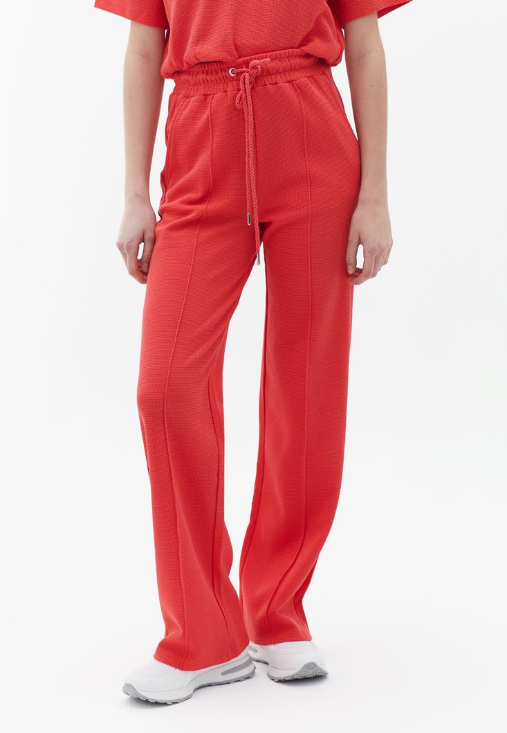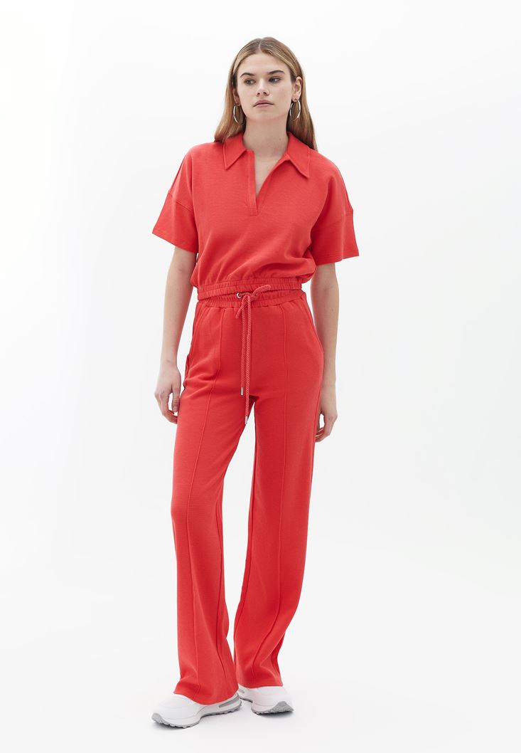 Pamuk karışımlı waffle kumaş, yüksek bel, bedenden uzak straight fit, düz paça, beli lastikli ve bağcıklı, ön kısmı beden boyunca dikiş detaylı, iki cepli.