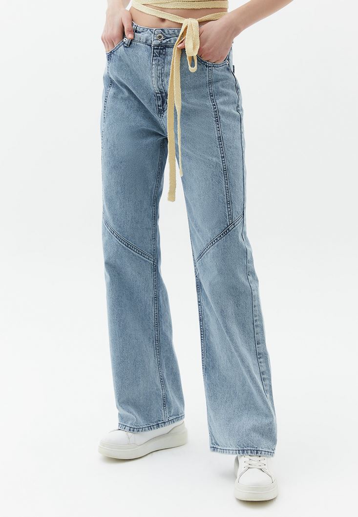 %100 pamuklu denim, yüksek bel, bedenden uzak baggy fit, bol paça, ön kısmı dikiş detaylı, önü ve arkası iki cepli.