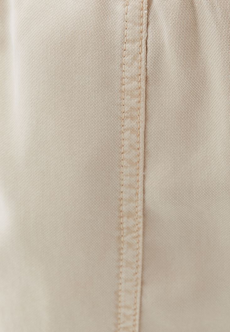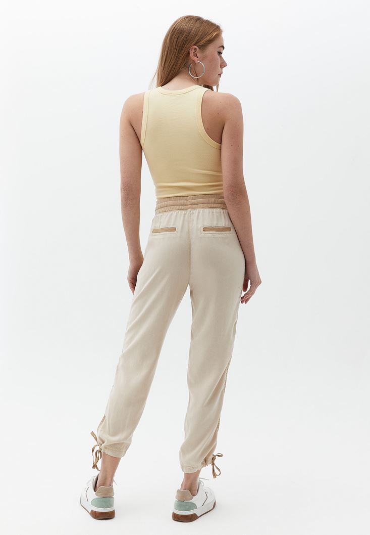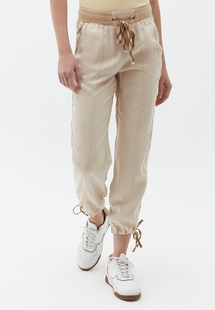 %100 Tencel(Lyocell) içerikli geri dönüştürülebilir doku, anti bakteriyel kumaş yapısı, yüksek bel, bedenden uzak baggy fit, slim paça, beli lastikli ve bağcıklık, paçası bağcıklı, önü iki cepli, arka kısmı cep görünümlü.