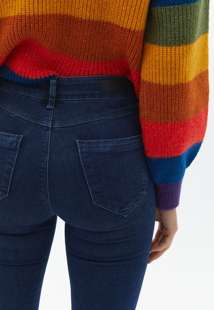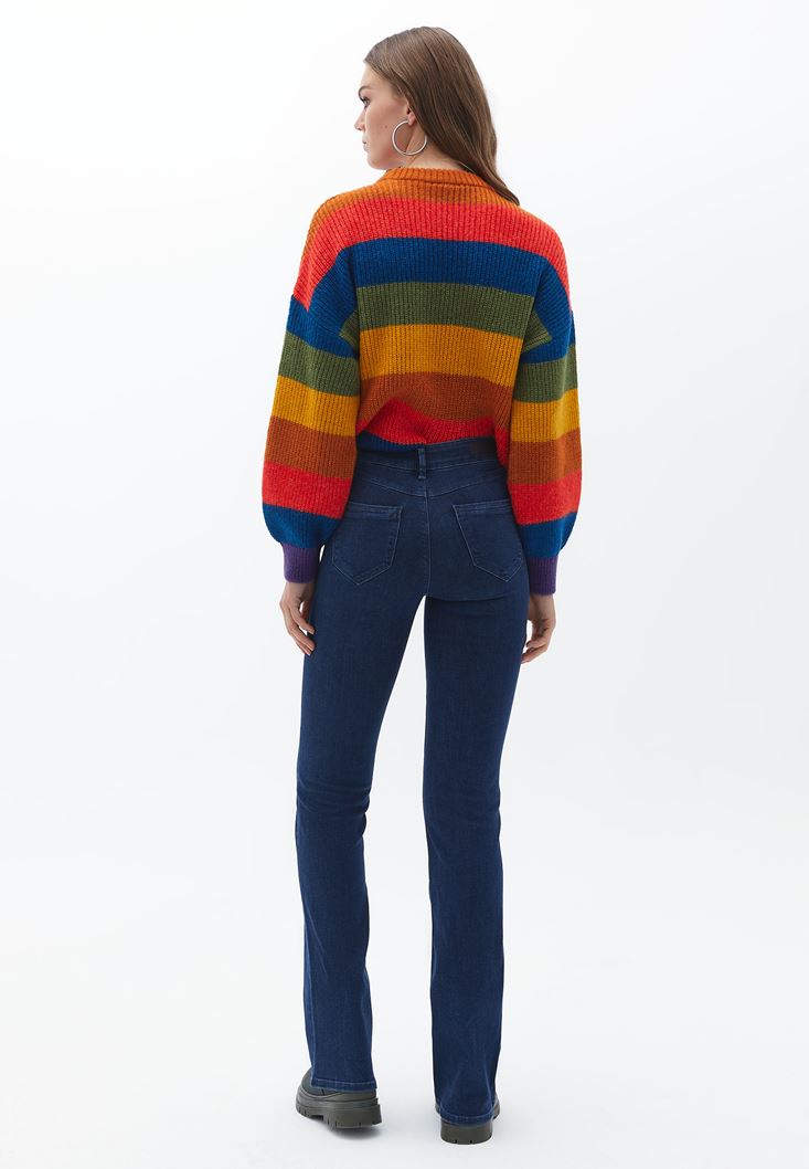 Pamuk içerikli denim doku, yüksek bel, boru paça, rahat ve esnek kalıp, bir beden ince gösteren push-up özellikli.