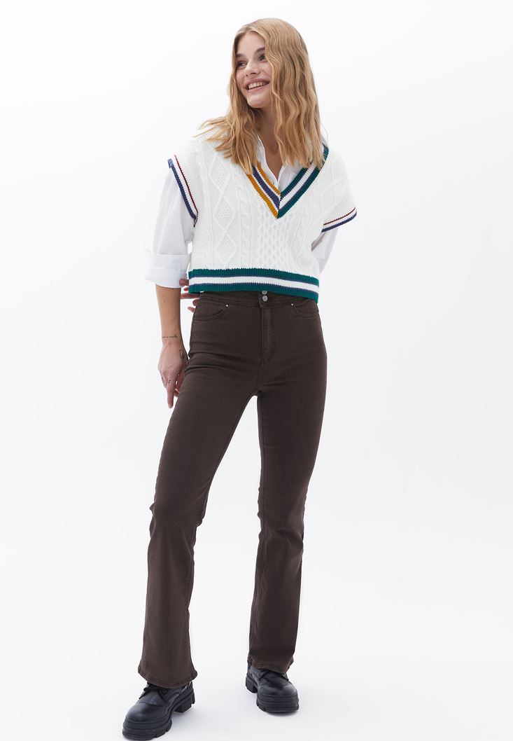 Pamuk ve Tencel(Lyocell) içerikli doğal karışımlı doku, yüksek bel, bot paça, bedene yakın rahat fit, önü iki cepli.