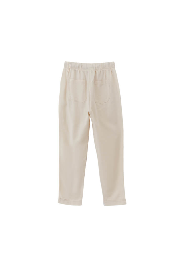 Pamuk ve viskon karışımlı özel doku, yüksek bel, havuç kalıp, beli lastikli ve bağcıklı, önü ve arkası iki cepli, salaş durması için bir beden büyük tercih edilebilir.