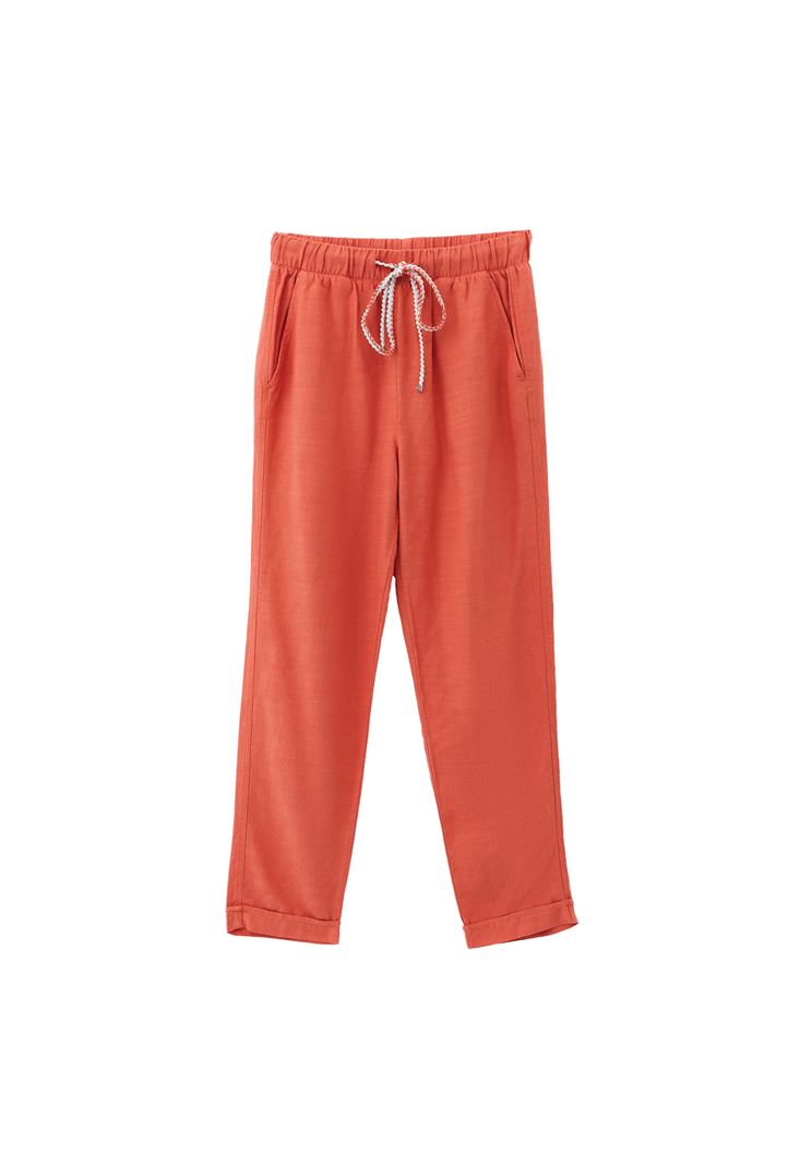 Pamuk ve viskon karışımlı özel doku, yüksek bel, havuç kalıp, beli lastikli ve bağcıklı, önü ve arkası iki cepli, salaş durması için bir beden büyük tercih edilebilir.