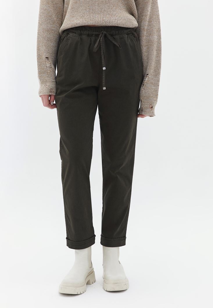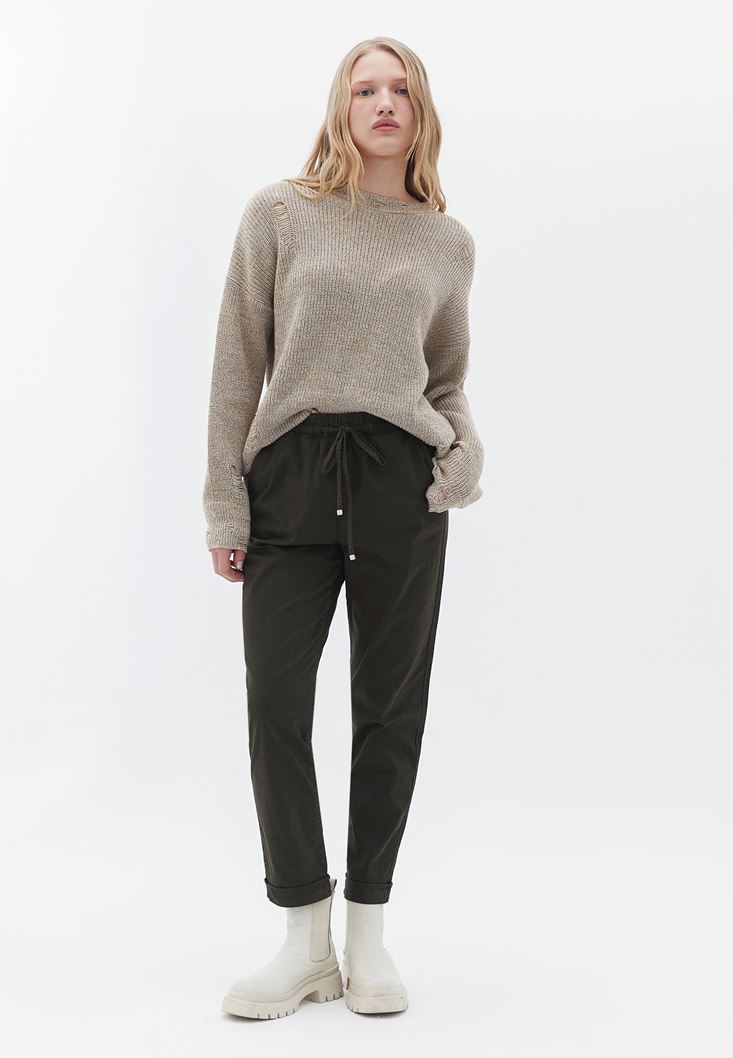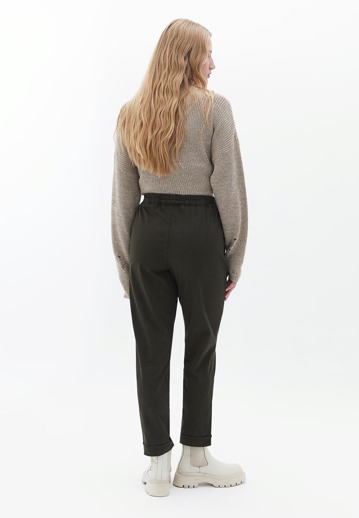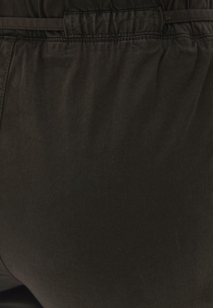 Pamuk içerikli özel doku, bedenden uzak rahat fit, havuç kesim, yüksek bel, beli bağcıklı, duble paça, iki cepli, duble paça.