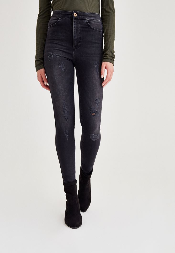 • Bayan Siyah Yüksek Bel Dar Paça Eskitme Denim Pantolon