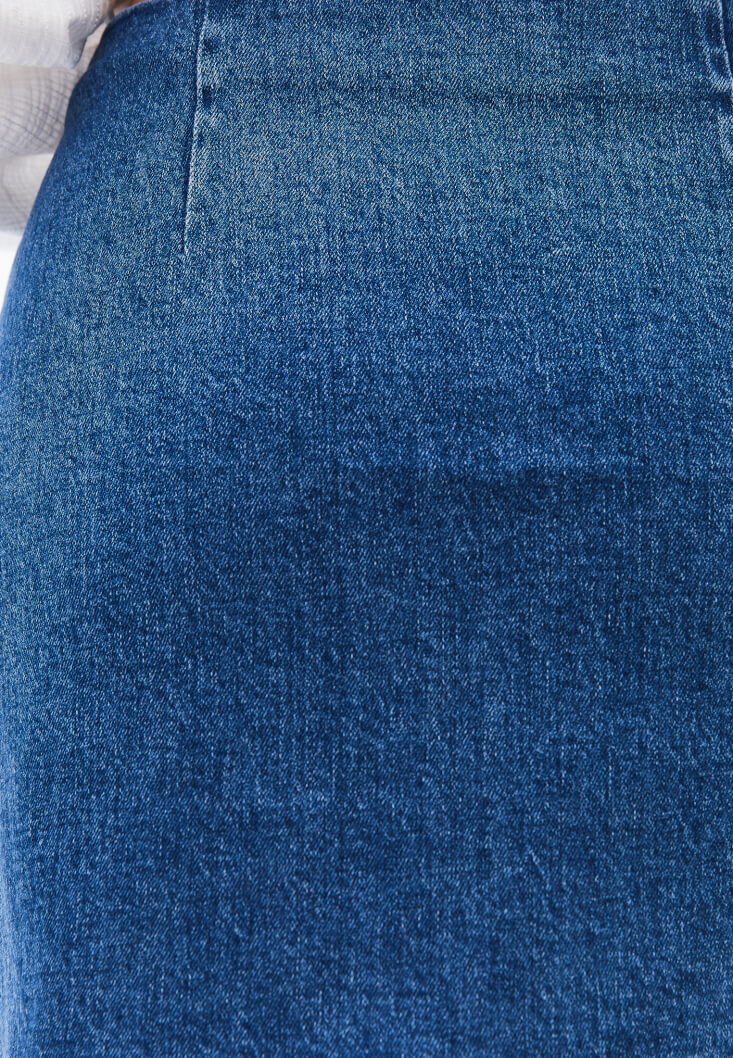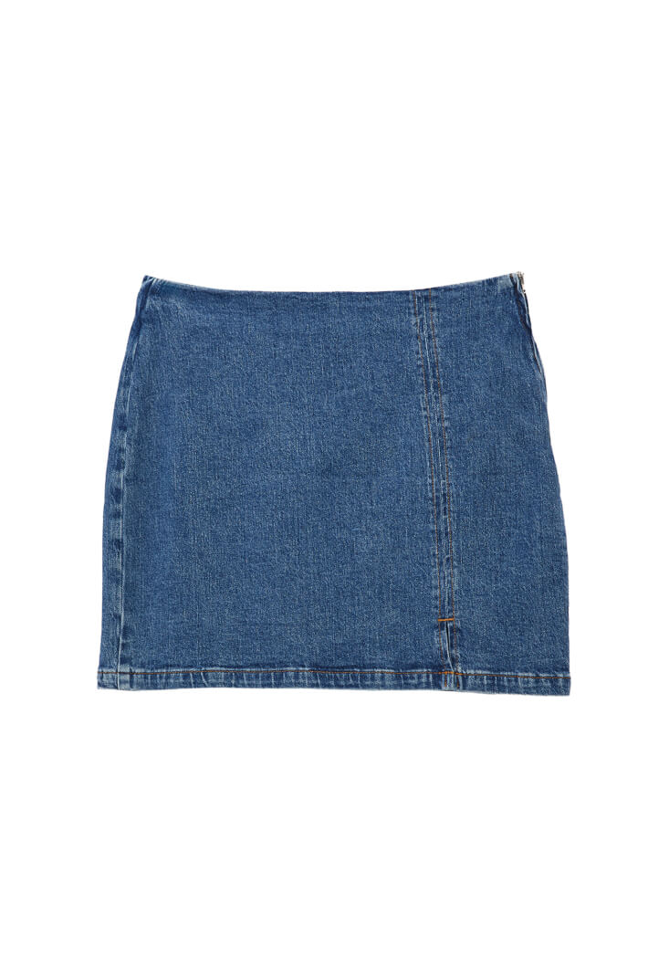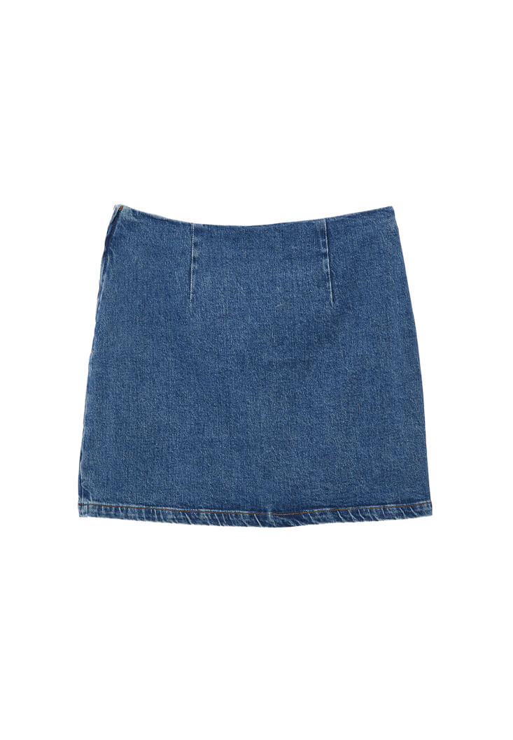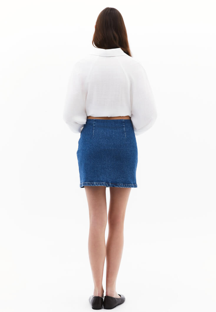 Pamuk içerikli denim, yüksek bel, mini boy, bedene yakın fit, ön kısmı kısa yırtmaçlı, yandan fermuar kapamalı.