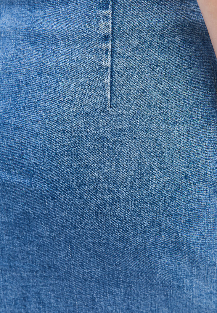Pamuk içerikli denim, yüksek bel, mini boy, bedene yakın fit, ön kısmı kısa yırtmaçlı, yandan fermuar kapamalı.