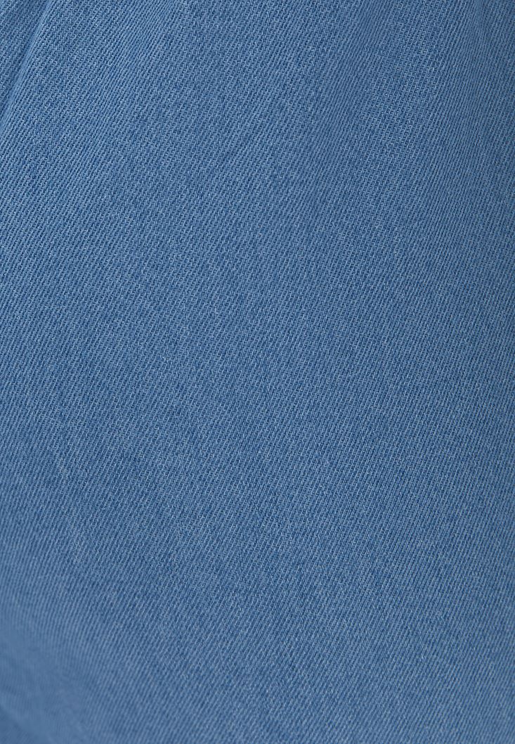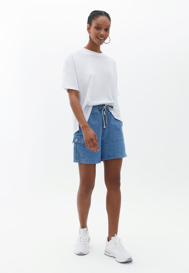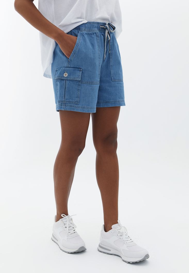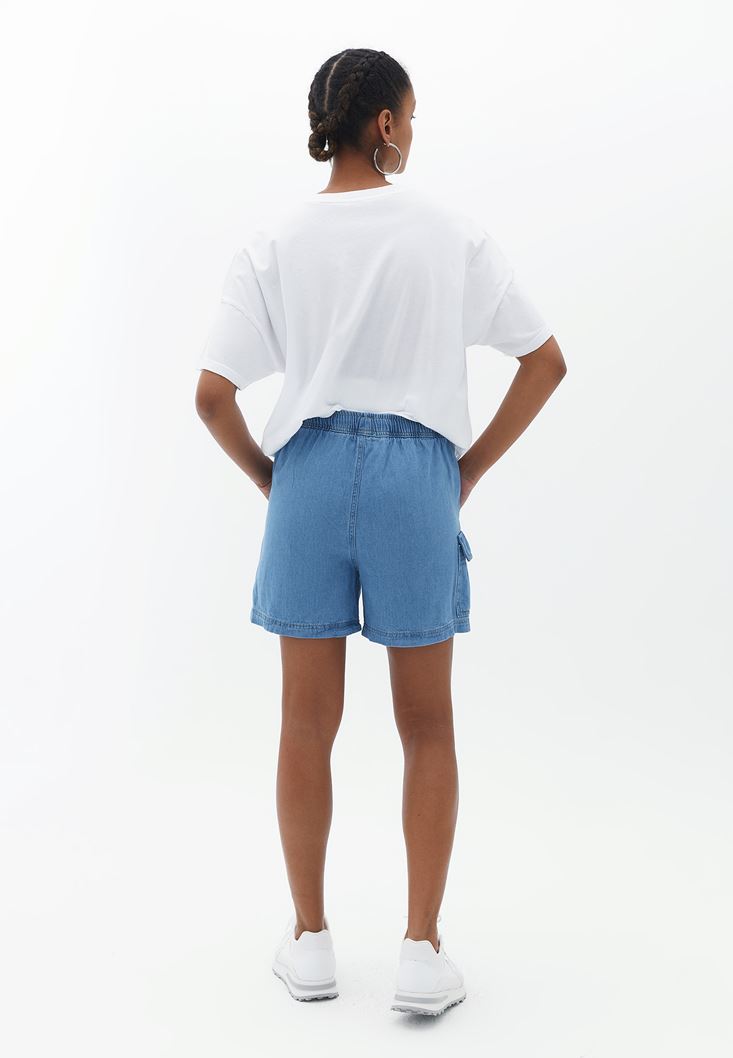 %100 pamuklu denim, yüksek bel, üst kısmı iki cepli, tek kargo cep detaylı, bedenden uzak rahat fit, beli lastikli ve bağcıklı, kısa boy kesimi.