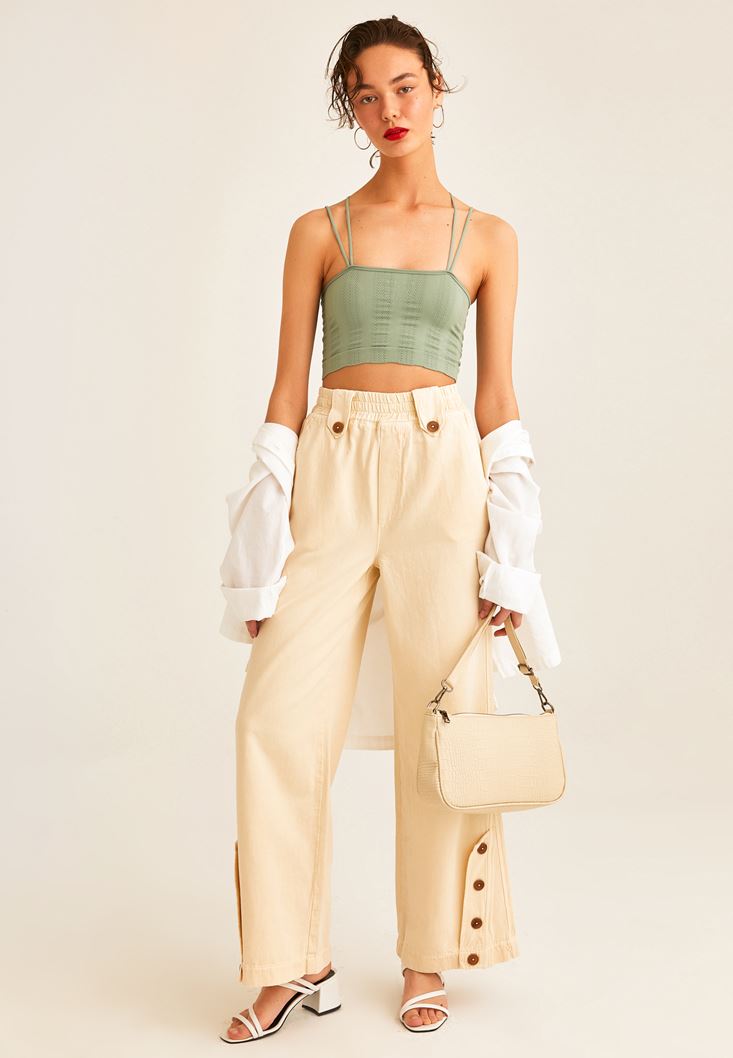 Düğme Detaylı Bol Pantolon modeli, yumuşak ve nefes alabilen kumaş yapısı ile yeni sezona dahil oluyor. Bol pantolon modeli, bel ve paça kısmındaki düğme ayrıntıları ile Oxxo'da karşınıza çıkıyor. Bol paça pantolon modeli ile kombinlerinizi dilediğiniz gibi vurgulayabilirsiniz. Yeni sezonun trendlerine eklenen bol pantolon modeli ile yüksek tabanlı sneakerları veya espadril ayakkabıları rahatlıkla kullanabilirsiniz. Oxxo'nun mükemmel dokularla ve dikkat çeken detaylarla sizlere sunduğu bol pantolon modelleri ile özgün bir duruş yakalayabilirsiniz.