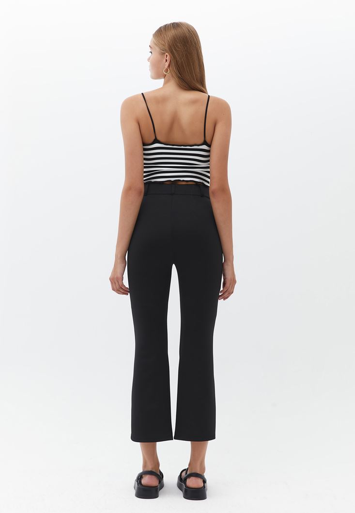 Özel esnek kumaş dokusu, yüksek bel, İspanyol paça, bedene yakın fit, bilek üstünde biten paça boyu.