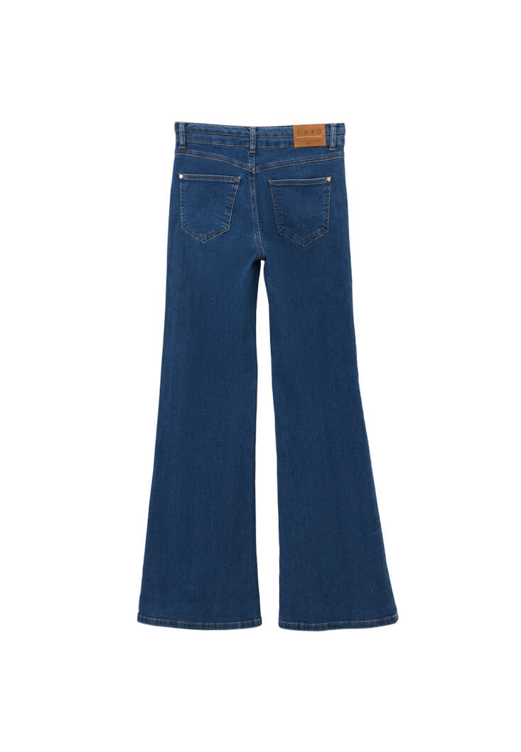 Pamuk karışımlı denim doku, yüksek bel, ispanyol paça, bedene yakın rahat fit, önü ve arkası iki cepli, çift düğme detaylı