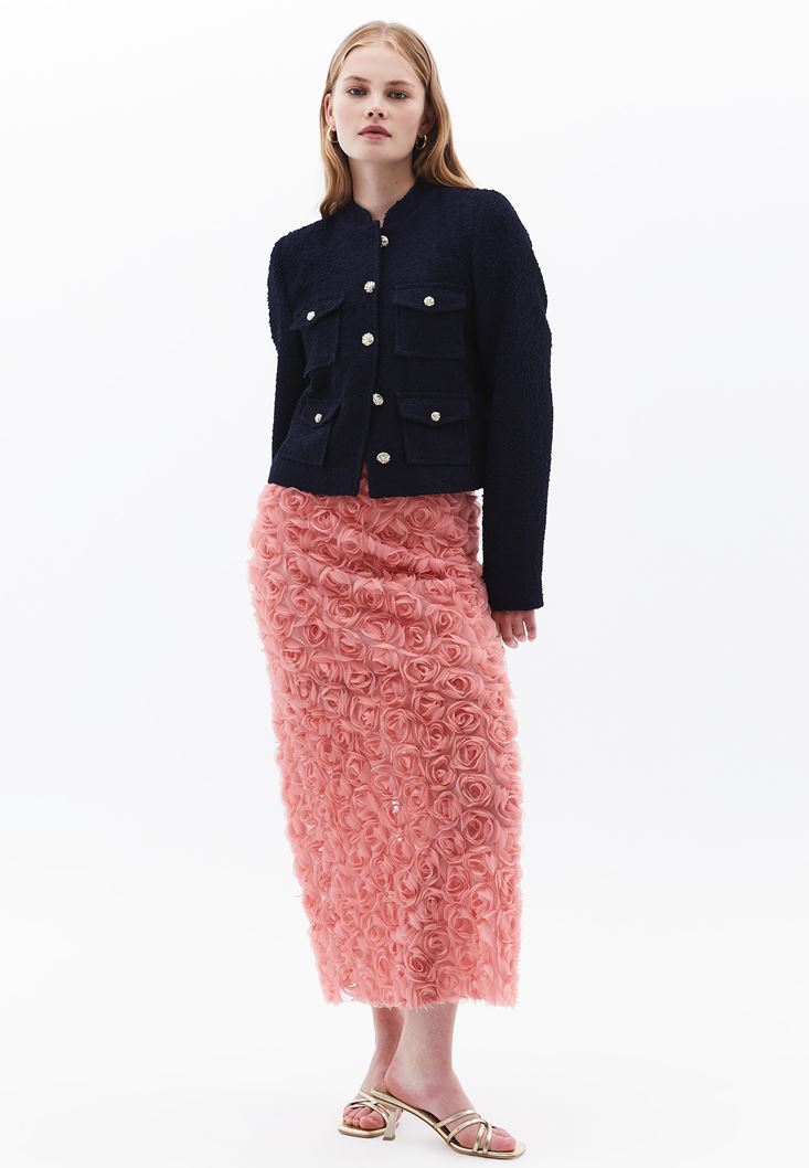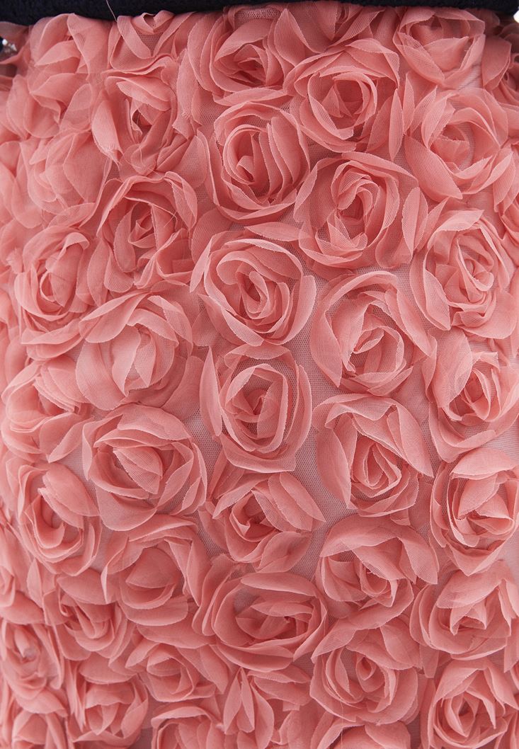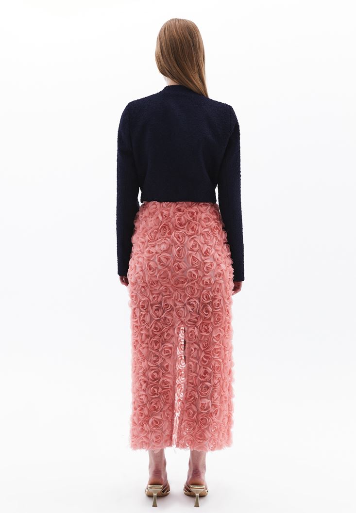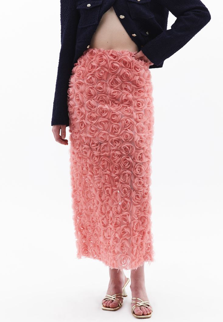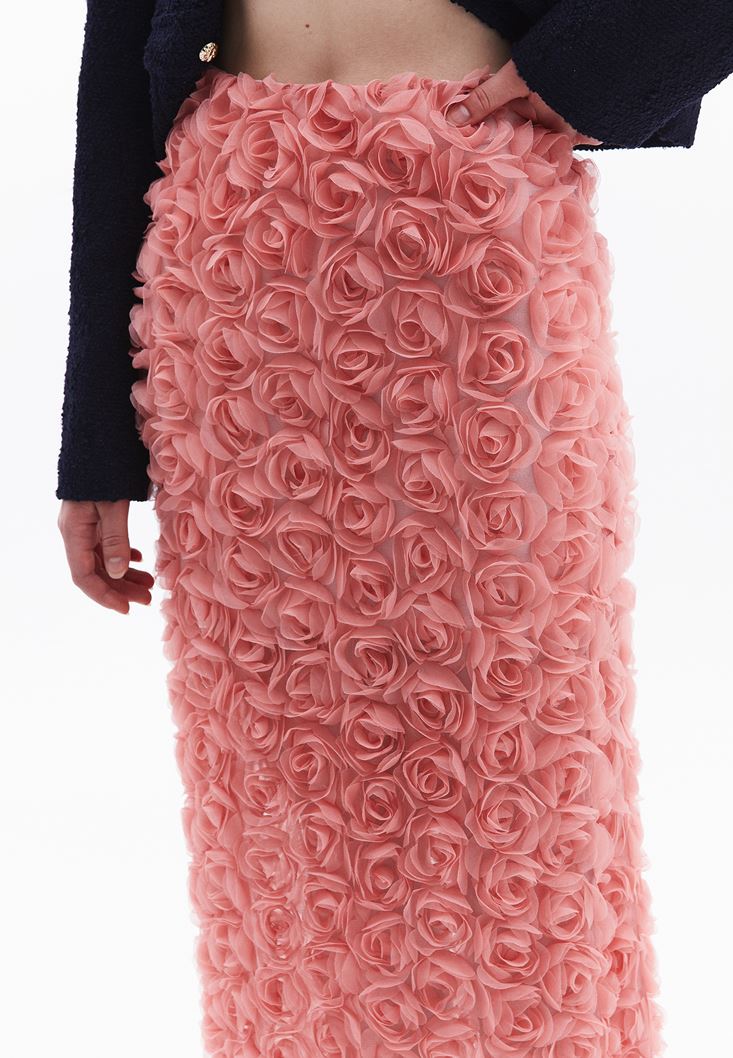 Üç boyutlu gül detaylı tasarım, yüksek bel, midi boy, beli lastikli, bedene yakın fit, içi astarlı, arka kısmı tek yırtmaçlı.