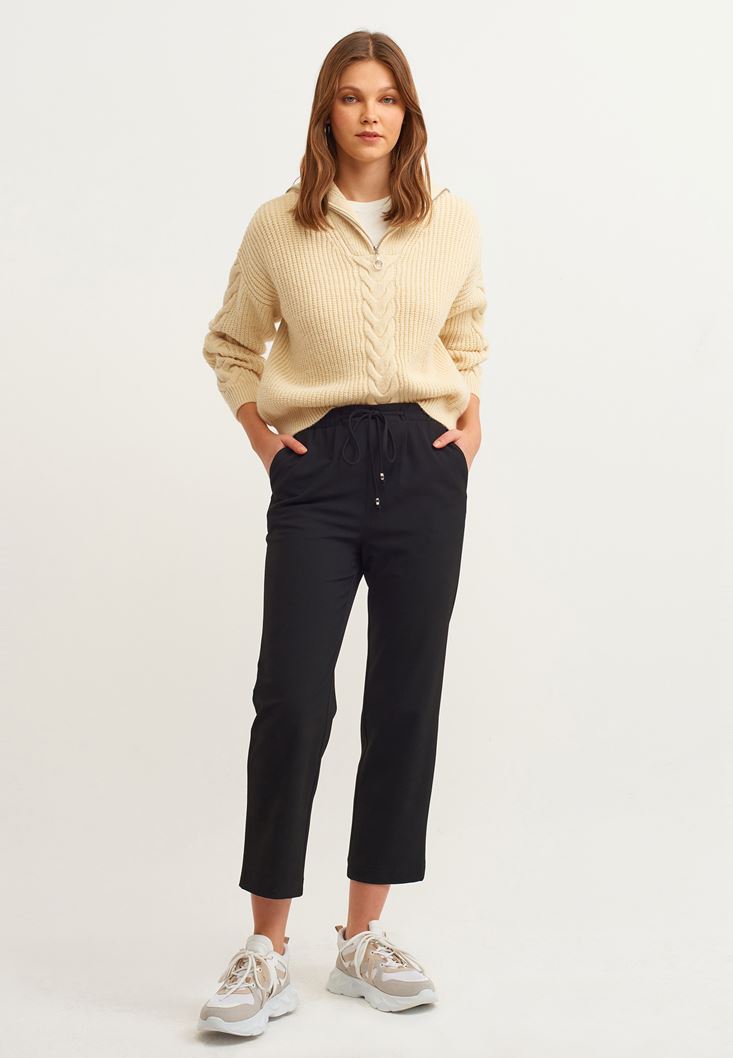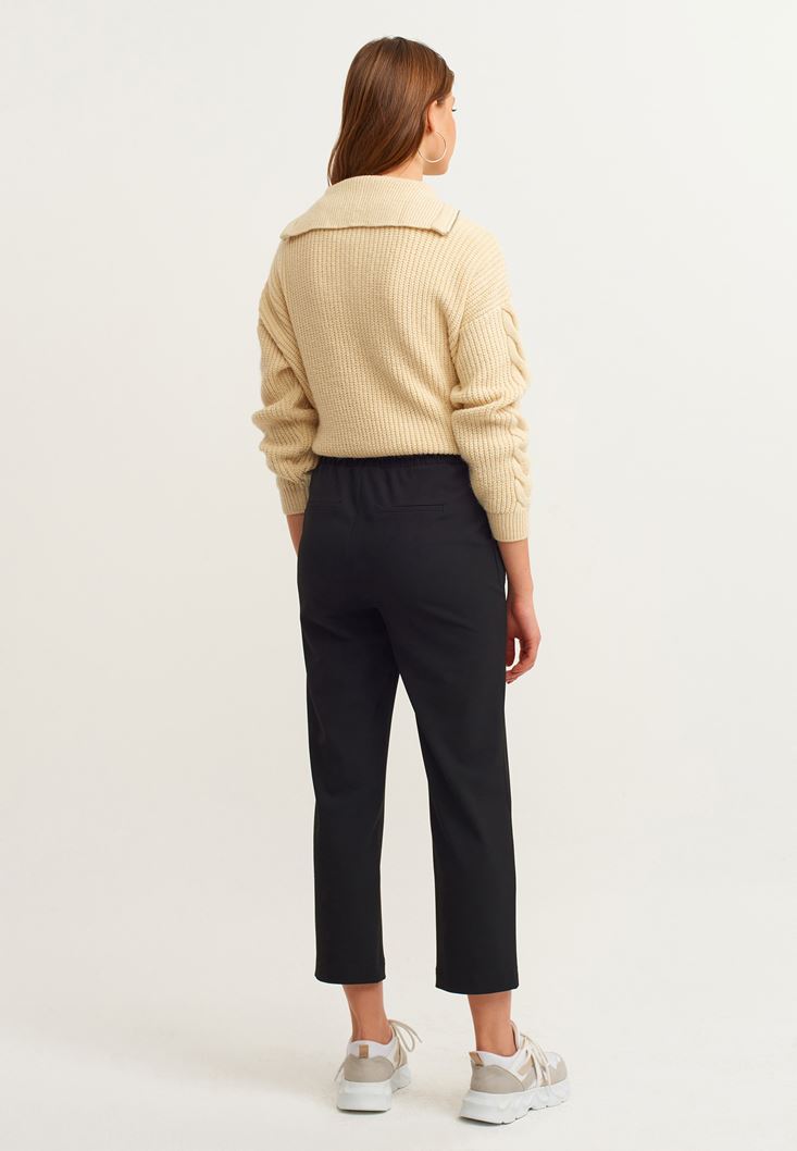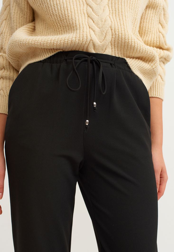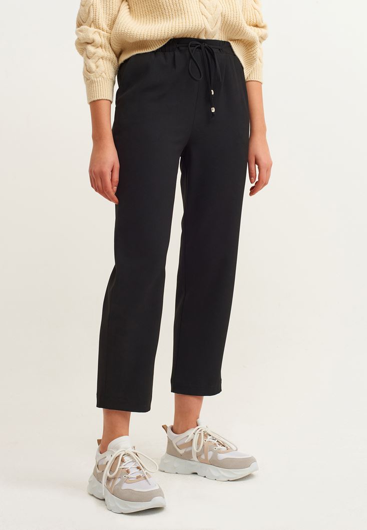 Viskon karışımlı özel doku, yüksek bel, havuç kalıp, straight paça, beli lastikli ve bağcıklı, ön kısmı iki cepli, arka kısmı cep görünümlü, bedene yakın rahat fit.