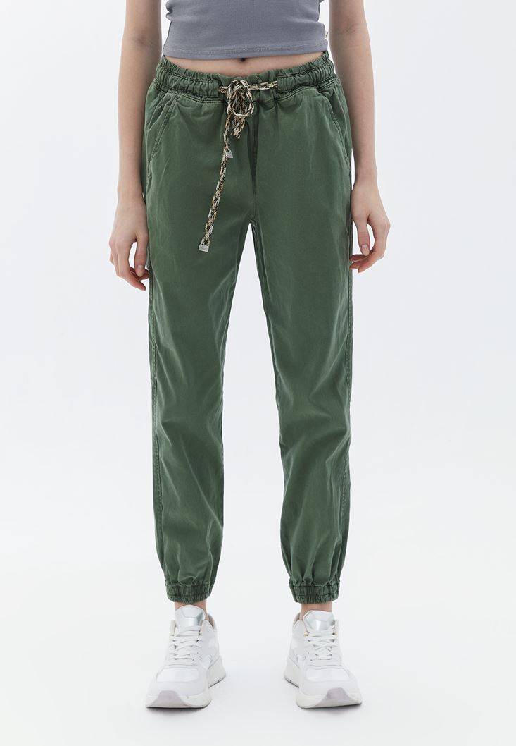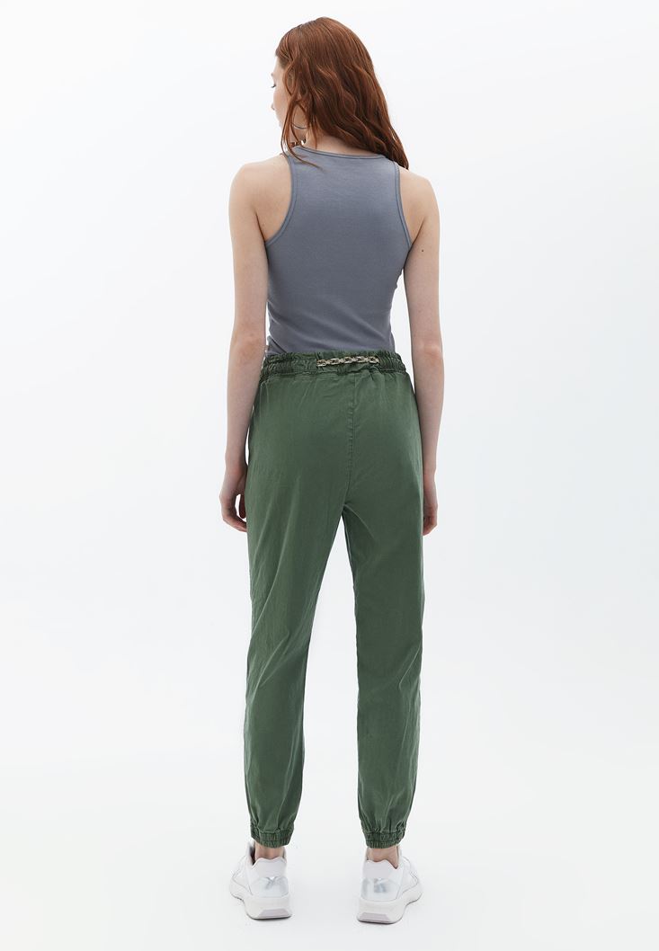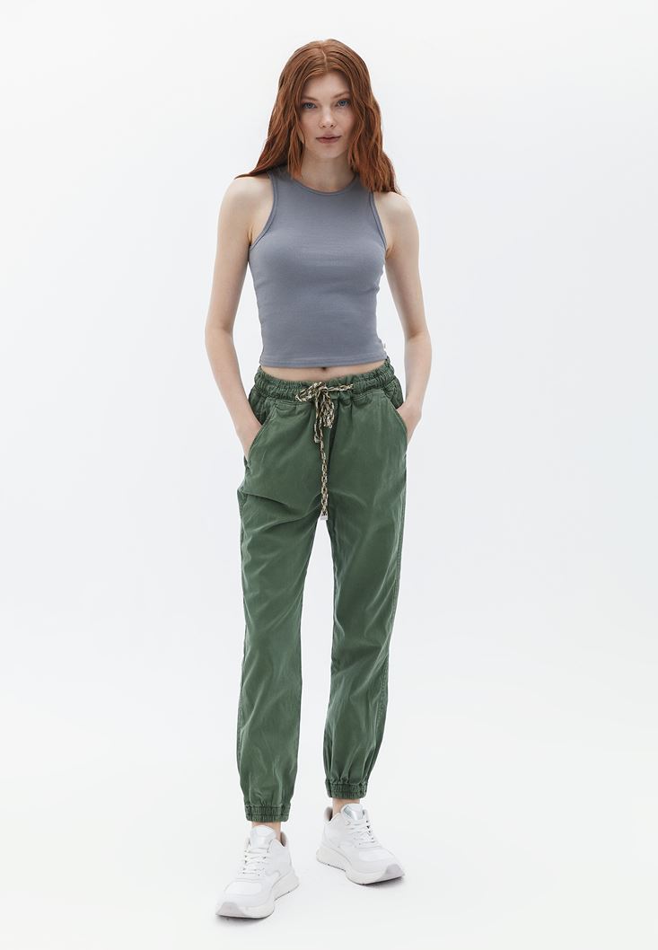 Tencel(Lyocell) ve pamuk karışımlı geri dönüştürülebilir doku, yüksek bel, bedenden uzak jogger fit, paçası lastikli, önü iki cepli, beli lastikli ve bağcıklı.