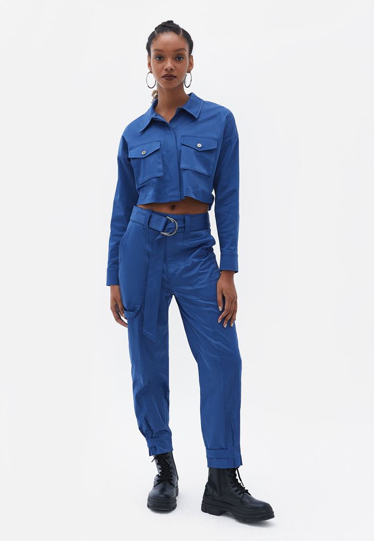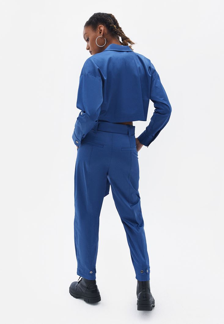 Pamuk karışımlı doku, havuç kalıp, yüksek bel, kendi kumaşından kemerli, önü iki cepli, paça detaylı, bedene yakın rahat fit.