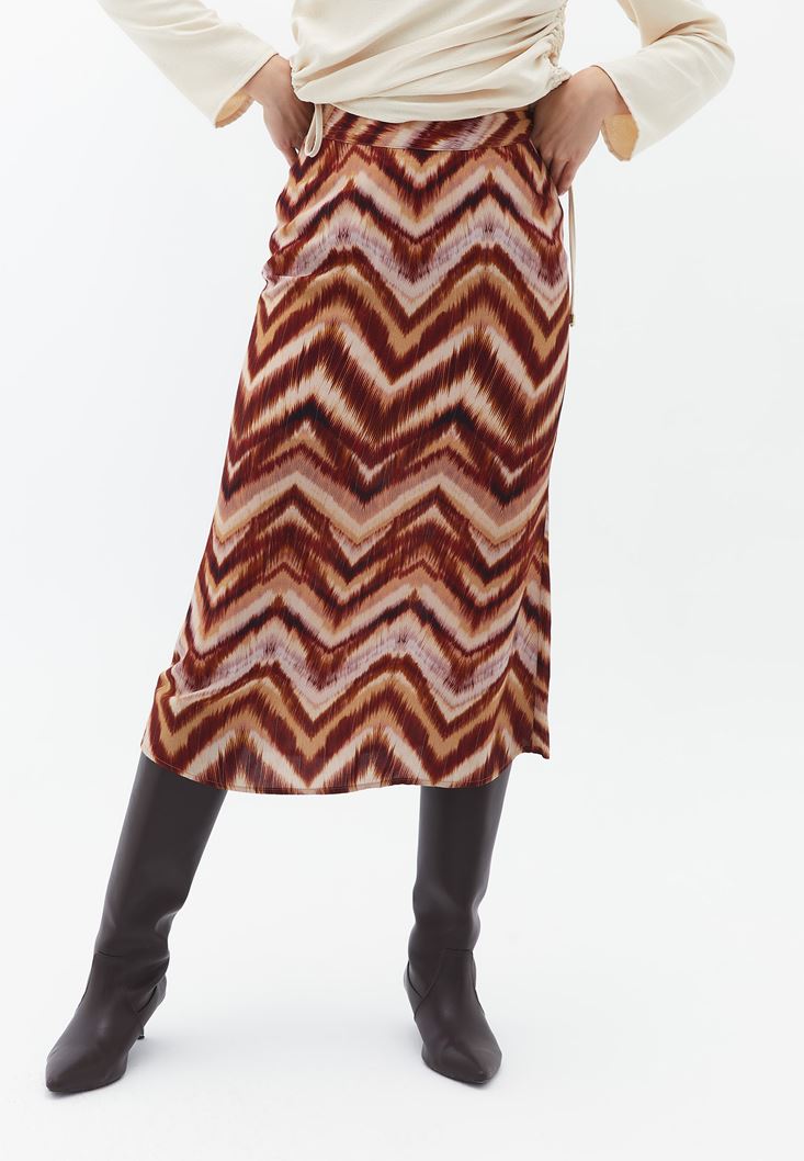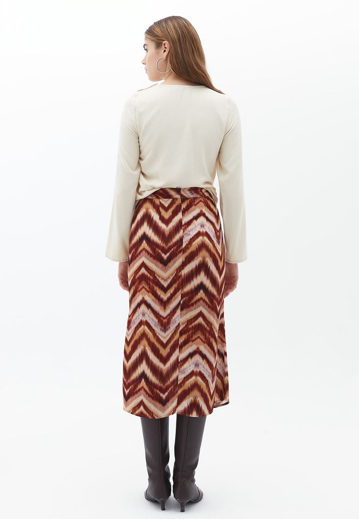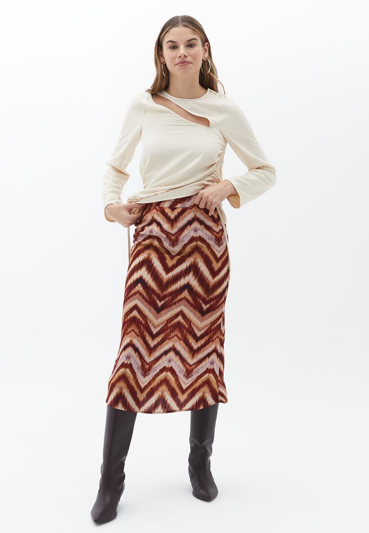 Viskon içerikli doku, midi boy, içi astarlı, arka kısmı fermuar kapamalı, bedene yakın fit, zikzak desenli.
