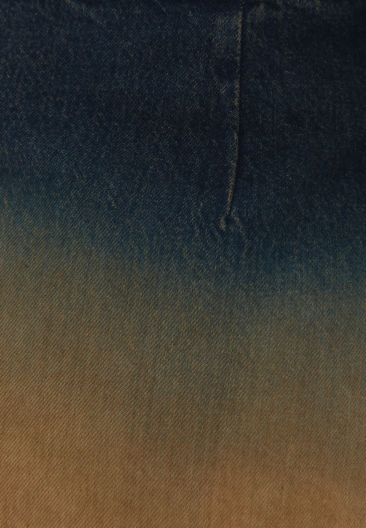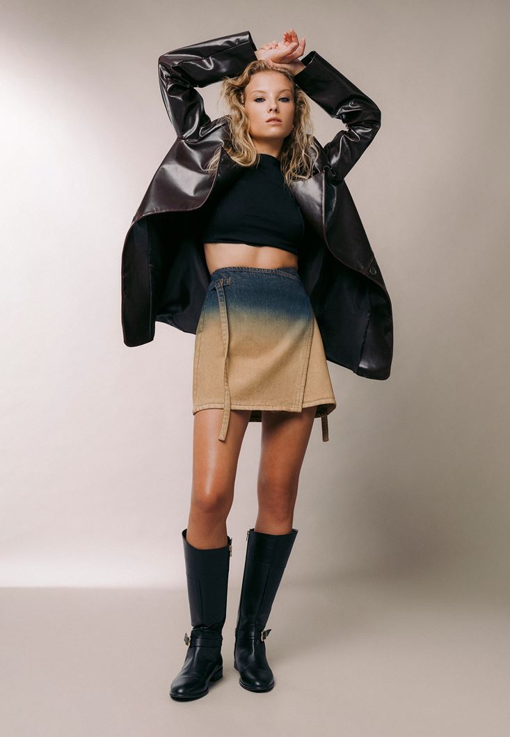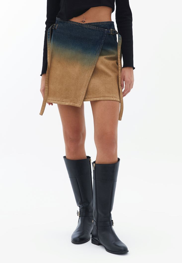 %100 pamuklu denim doku, yıkamalı görünüm, yüksek bel, a kesim, beli kuşak detaylı, ön kısmı asimetrik kapamalı.