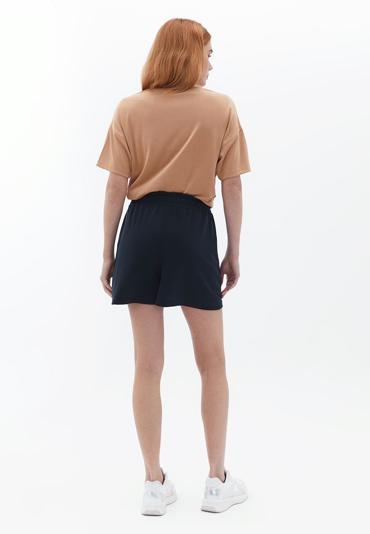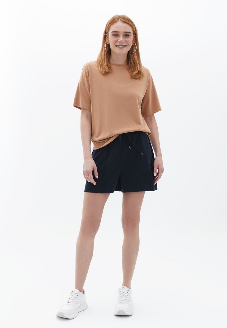 Modal karışımlı yumuşak doku, bedenden uzak rahat fit, yüksek bel, mini kesim, beli lastikli ve bağcıklı, iki cepli.