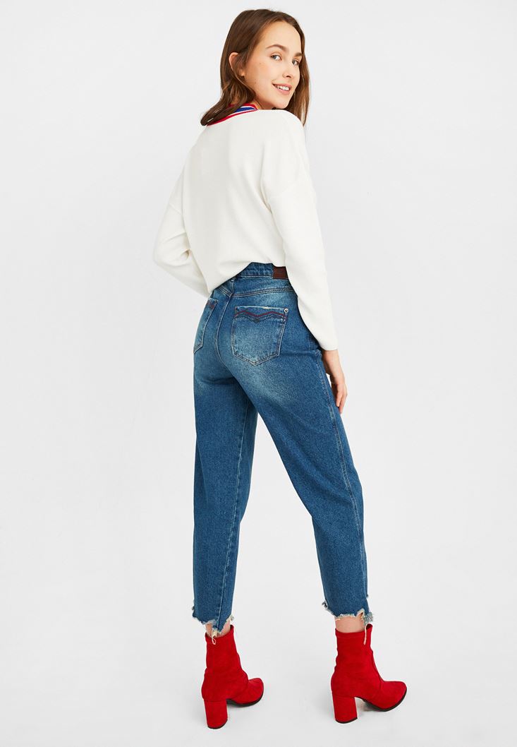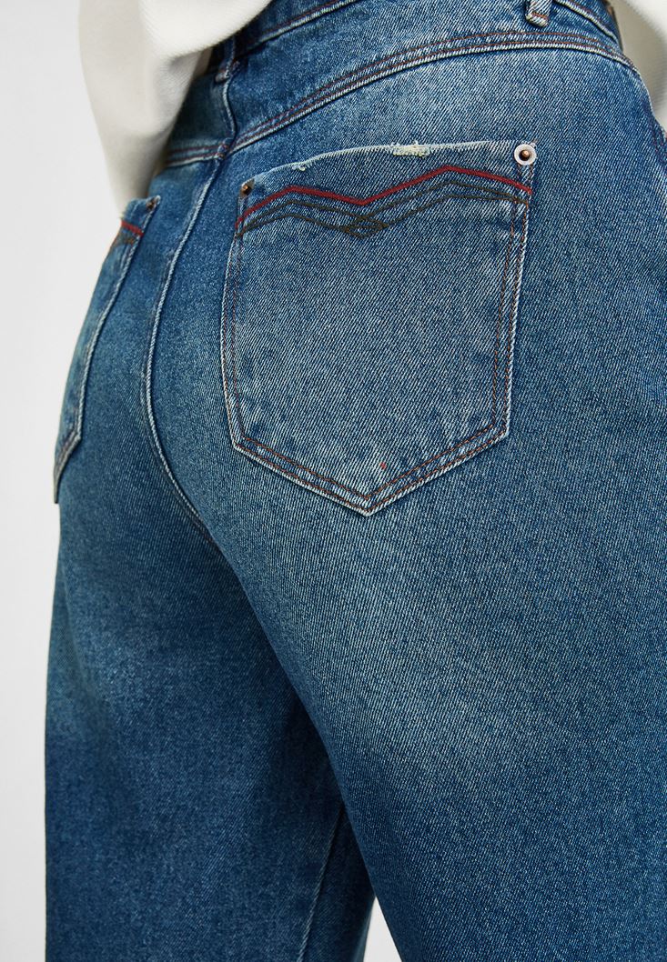 Mavi Yüksek Bel Paça Detaylı Mom Jean