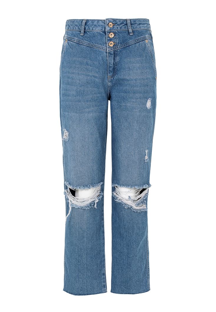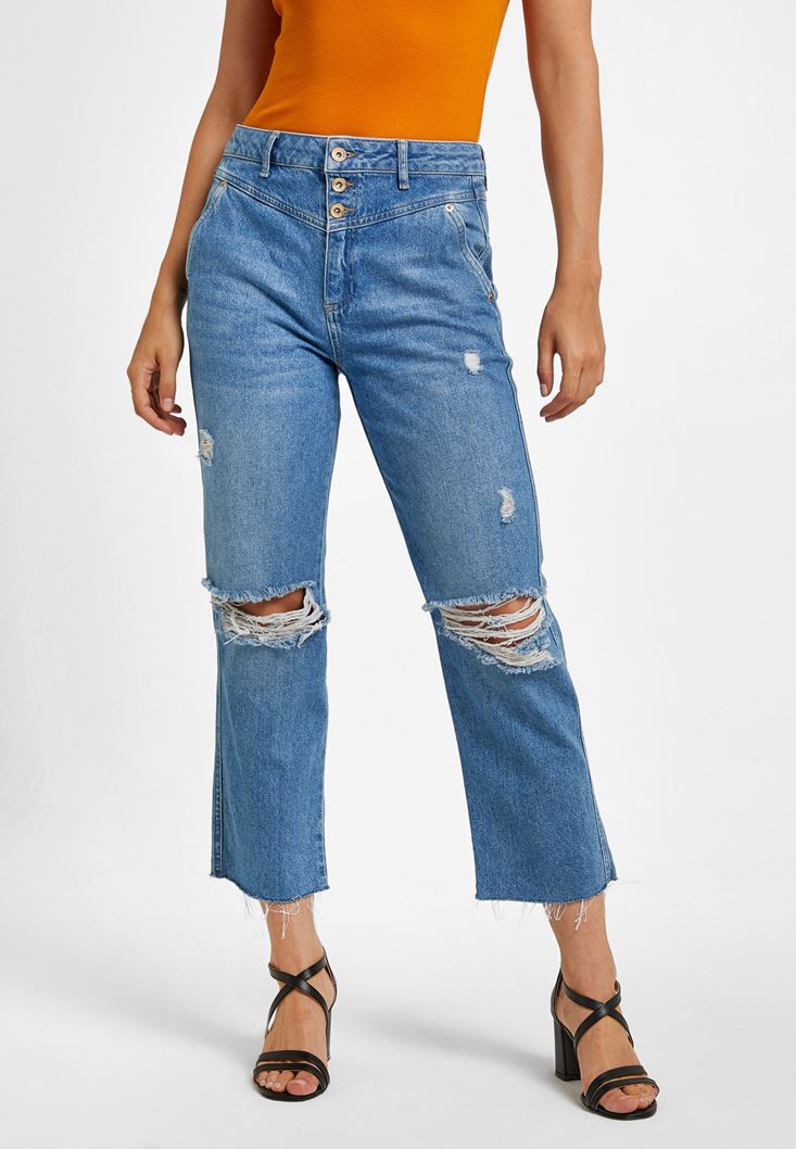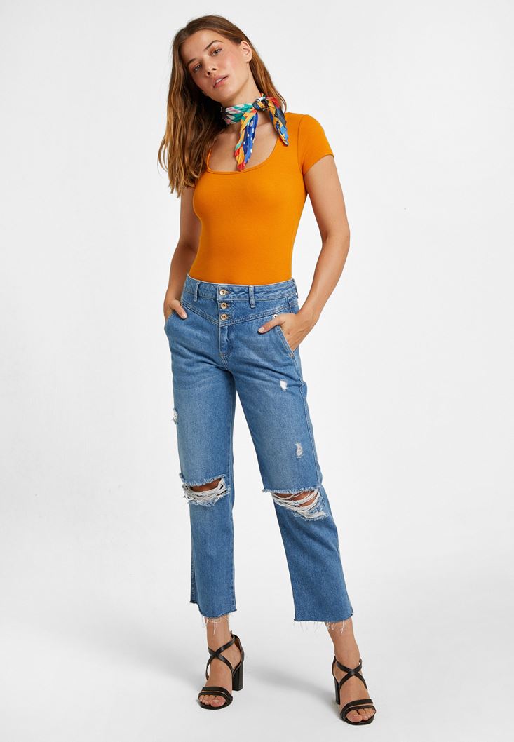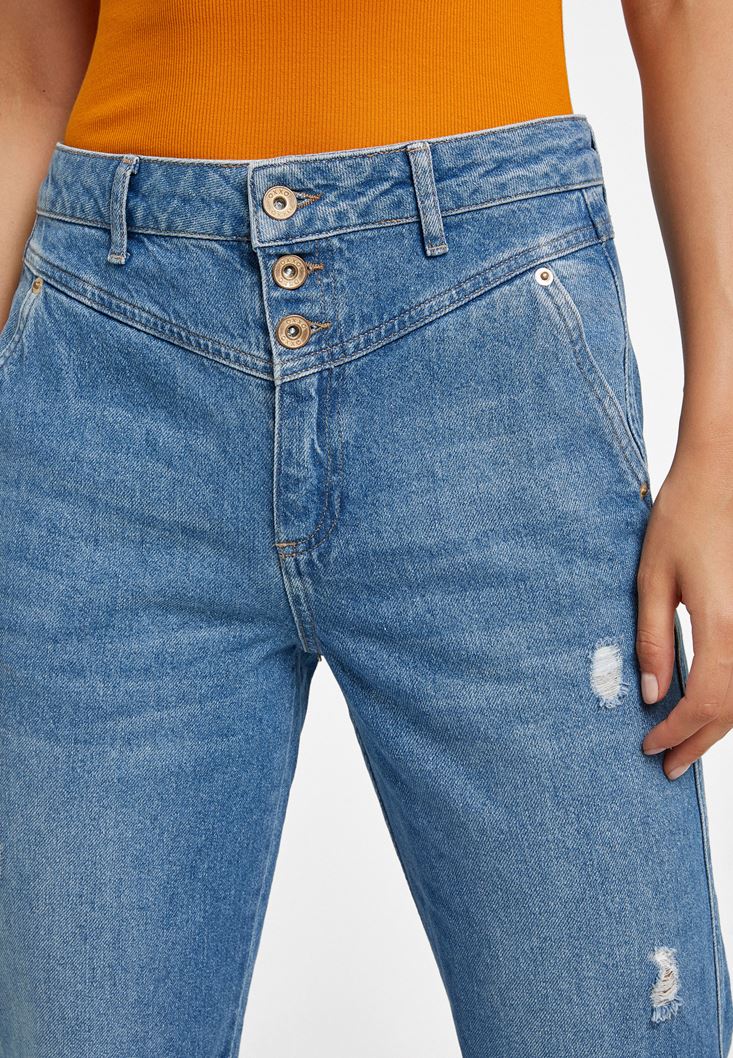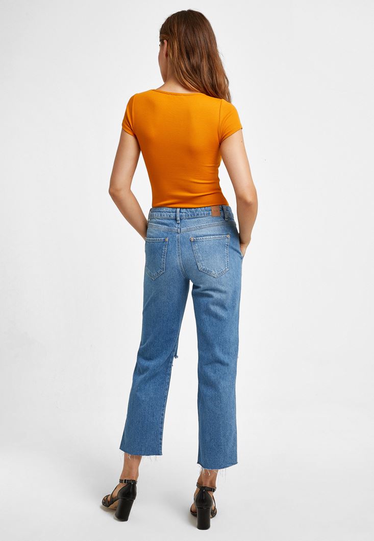 Yumuşak Dokulu Tişört ve Düğme Detaylı Mom Jean Kombini