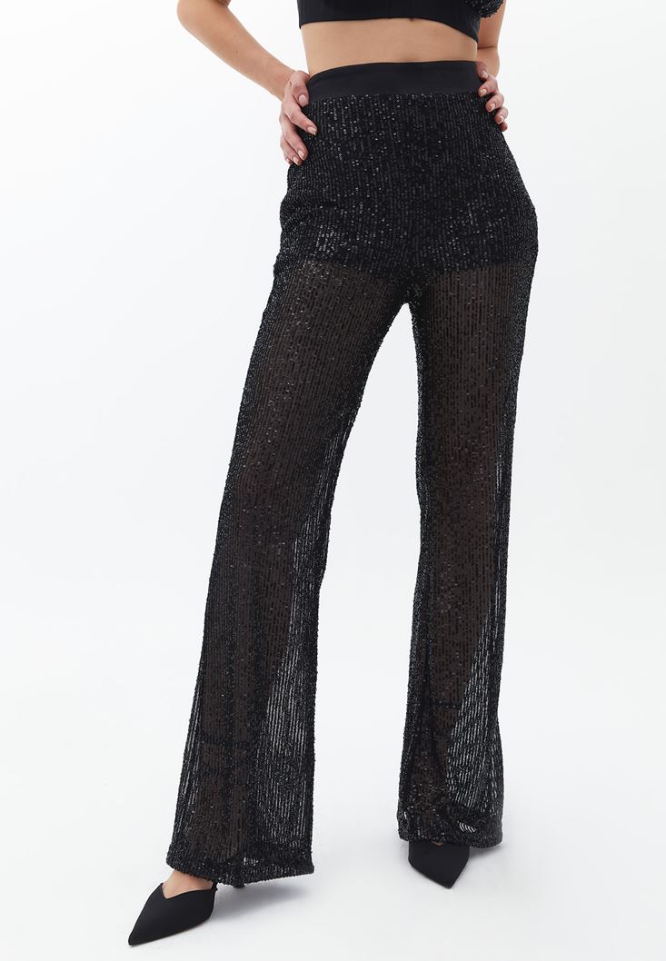 Payetli transparan doku, ultra yüksek bel, straight paça, içi kısa astarlı, yan kısmı gizli fermuarlı, bedenden uzak fit.