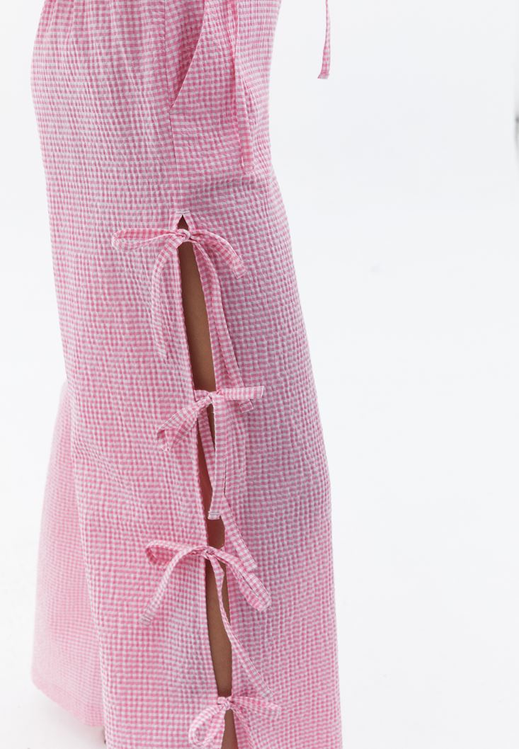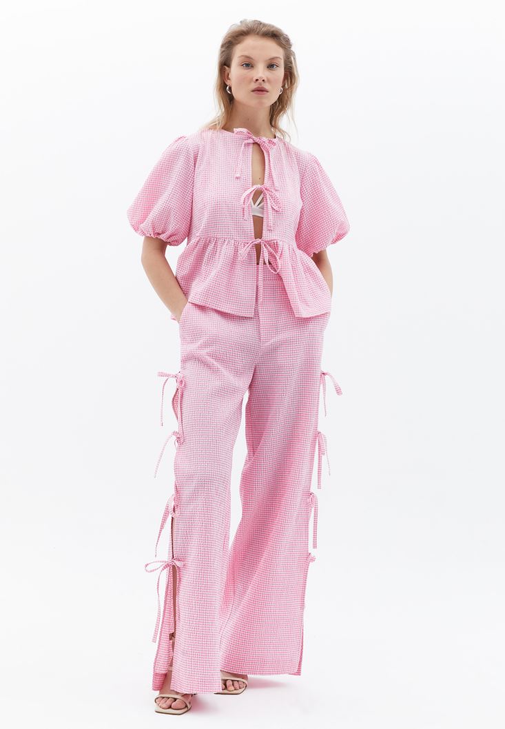 Pamuk karışımlı doku, pötikare desenli, yüksek bel, bedenden uzak straight fit, geniş paça, yan kısımları yırtmaçlı ve bağlama detaylı, iki cepli.