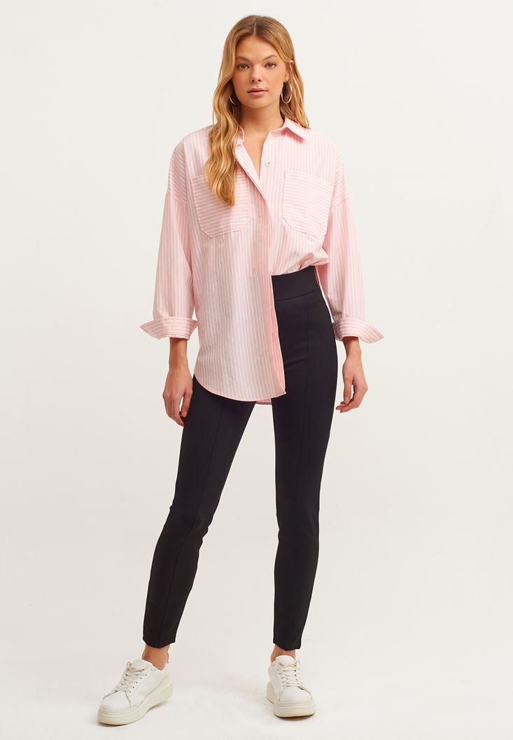 Viskon karışımlı esnek doku, yüksek bel, bedeni saran skinny fit, dar paça, ön kısmı dikiş detaylı, beli lastikli.
