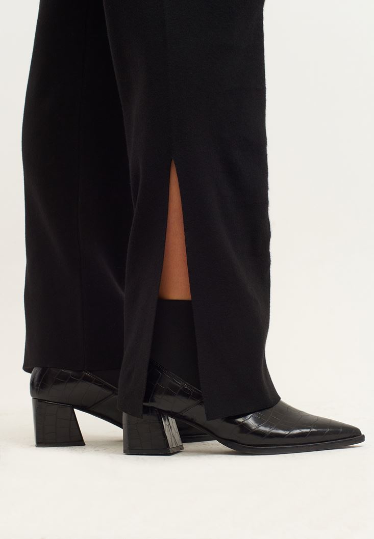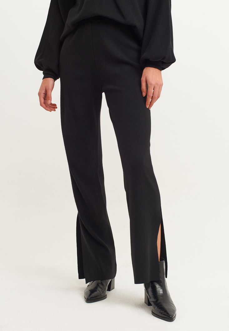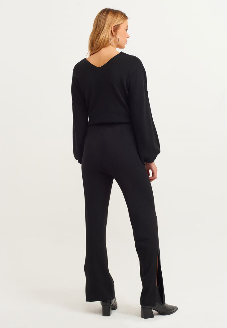 Viskon karışımlı triko, yüksek bel, bol paça, bedenden uzak relax fit, paçaları yırtmaçlı, beli gipeli.