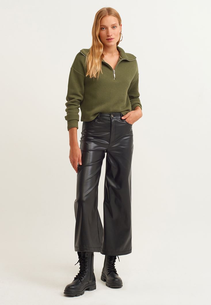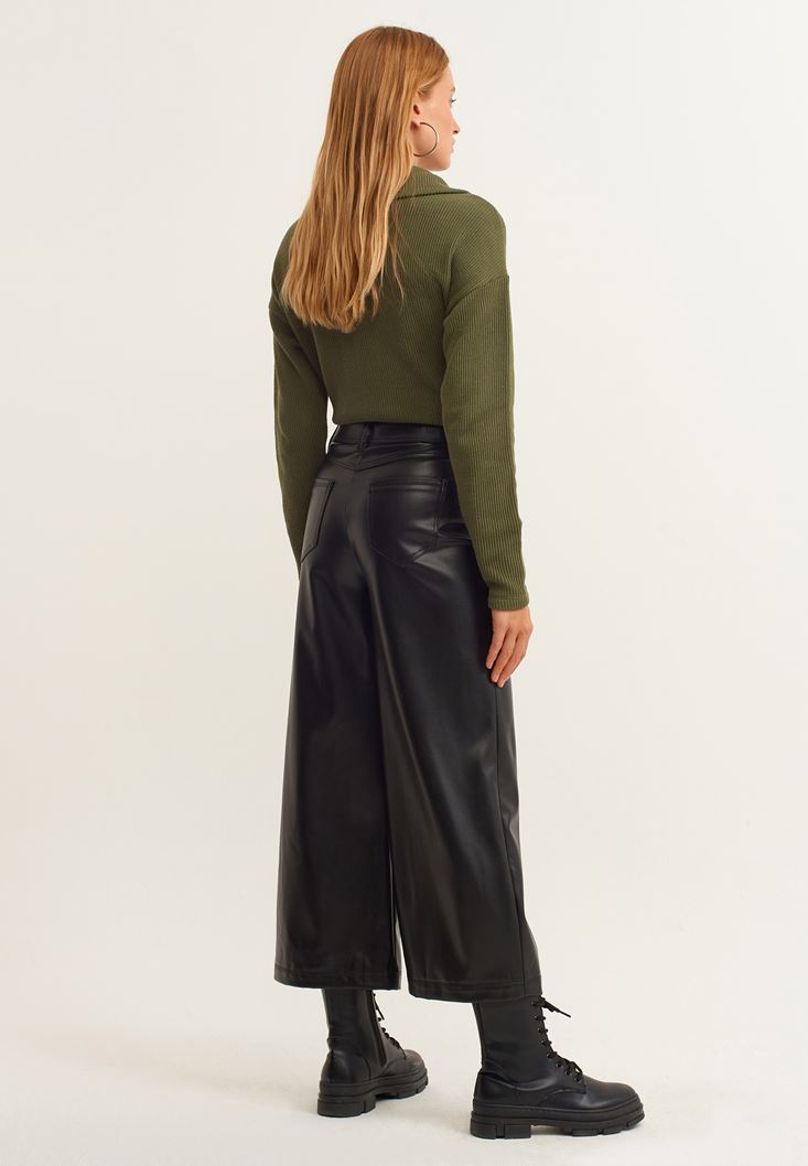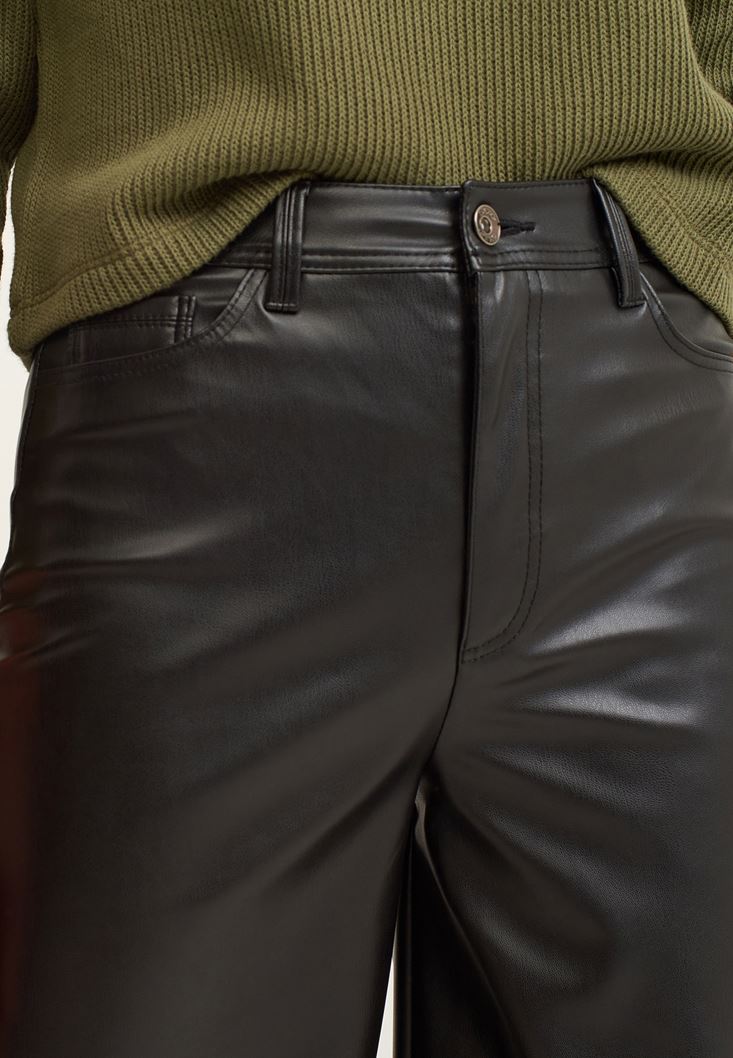 Parlak vegan deri doku, ultra yüksek bel, bol paça, bilekte biten paça boyu, ön ve arka kısmı iki cepli, bedene yakın fit.