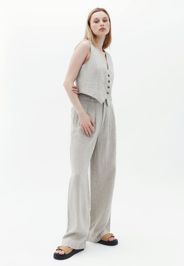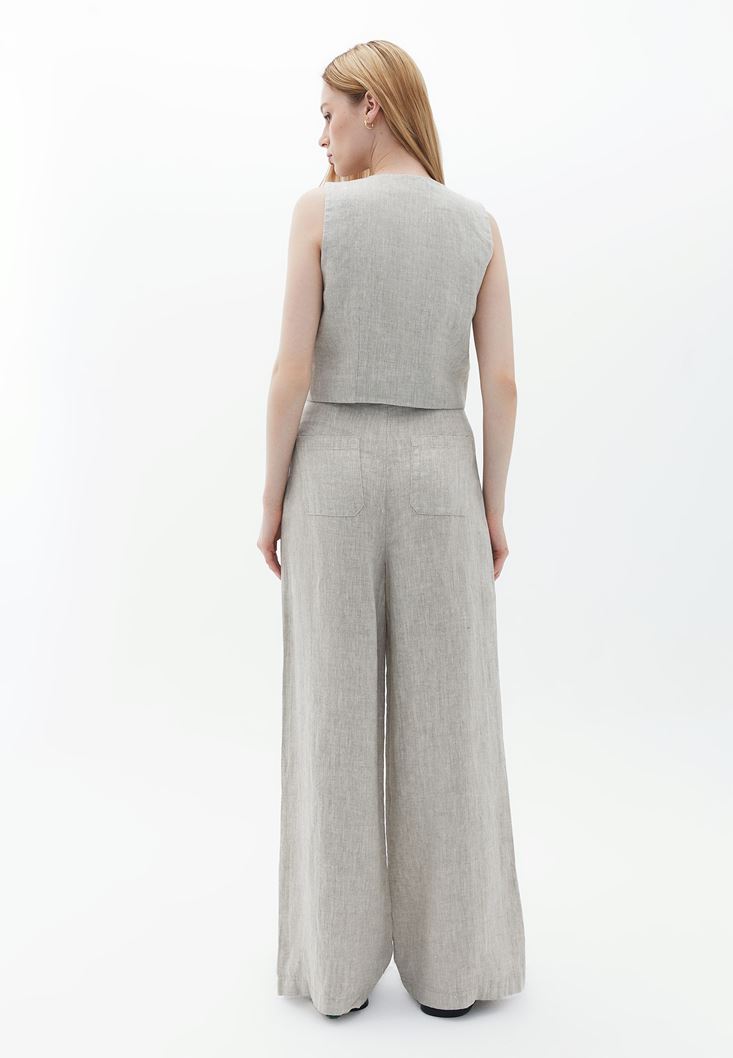 Bej Yüksek Bel Wide-Leg Keten Pantolon