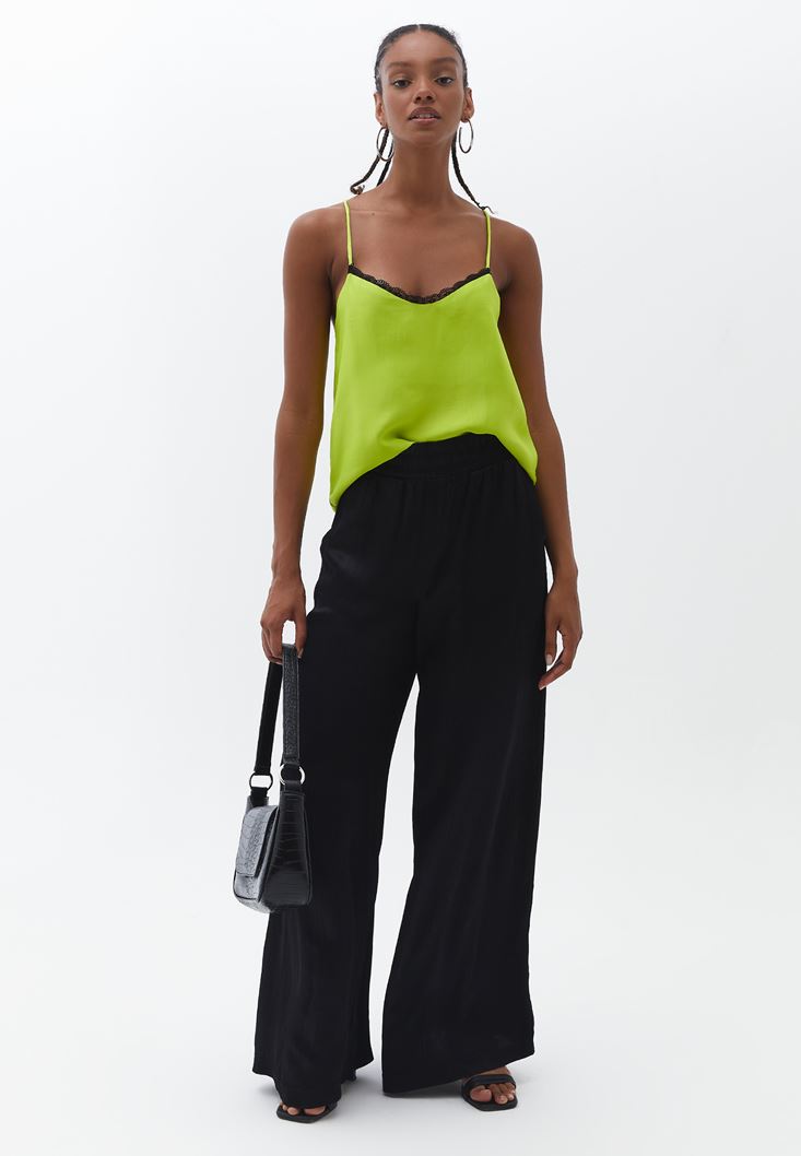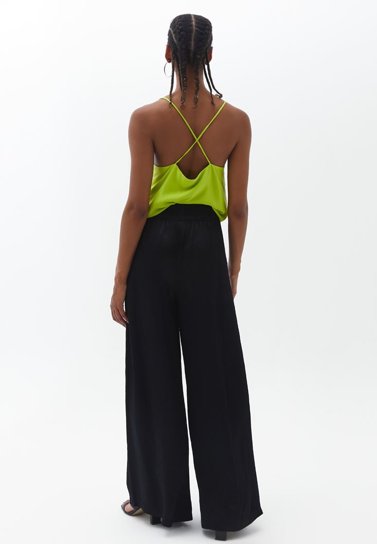 Tencel(Lyocell) ve viskon karışımlı geri dönüştürülebilir doku, nefes alabilen kumaş yapısı, ultra yüksek bel, bedenden uzak fit, önü iki cepli, saten görünümlü, beli lastikli, bol paça.