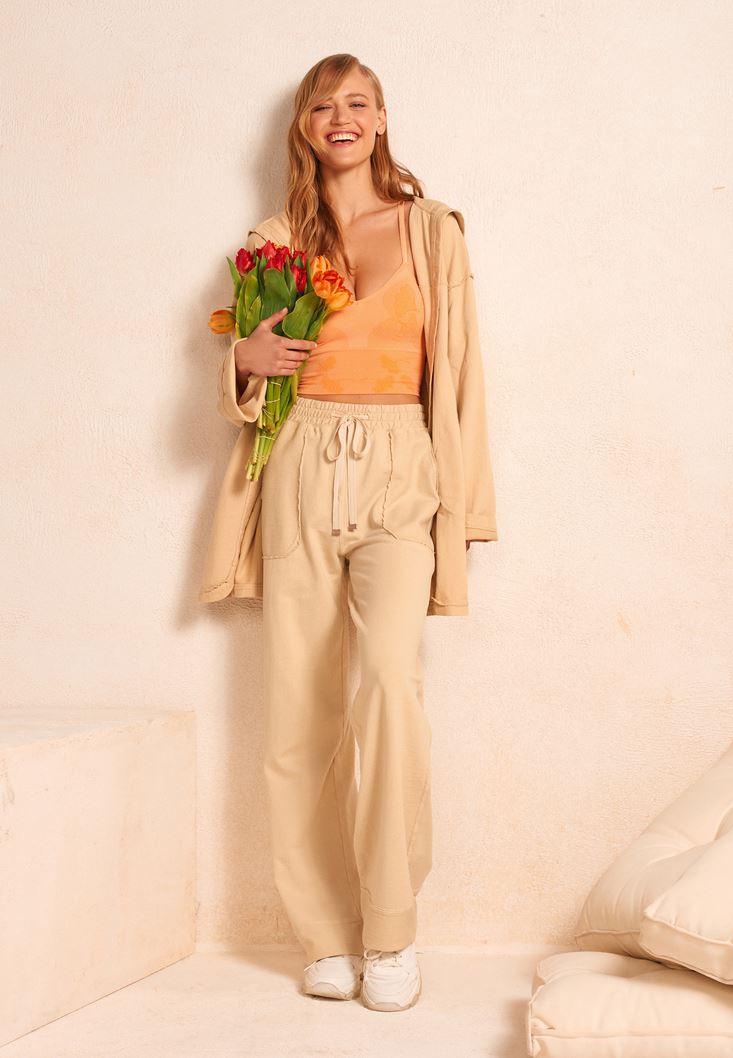 %100 pamuk içerikli doku, bol paça formu, bağcıklı ve lastikli yüksek bel, ön iki büyük cep.