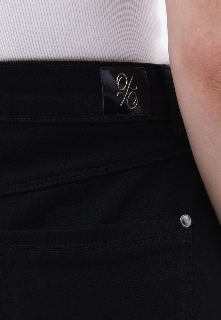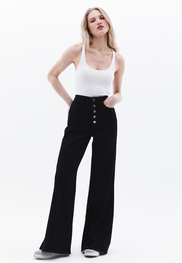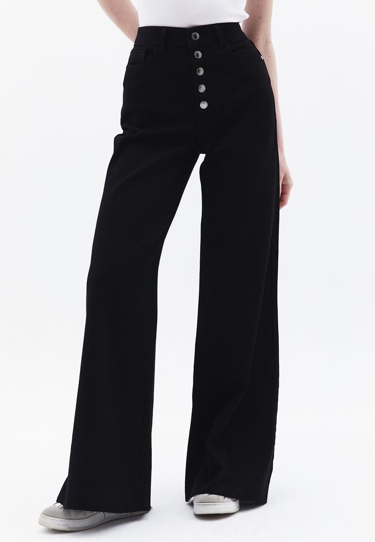 Pamuk karışımlı denim, yüksek bel, bol paça, bedenden uzak rahat fit, çok düğmeli tasarım, önü ve arkası ikişer cepli.