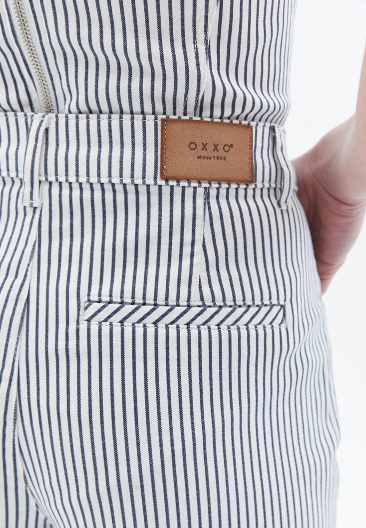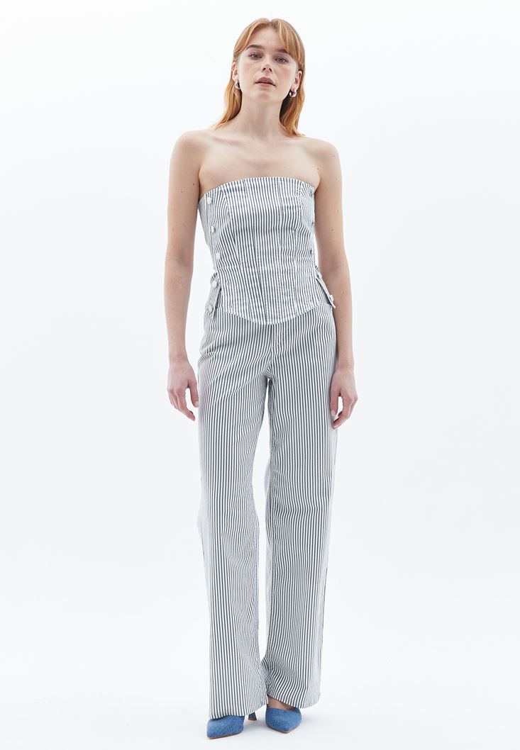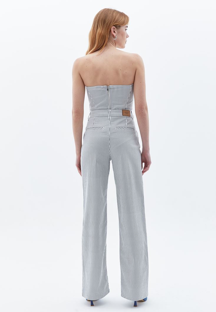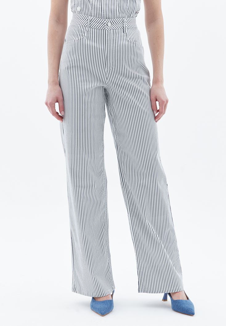 Pamuk karışımlı esnek doku, yüksek bel, çizgi desenli, bol paça, wide fit, iki cepli.