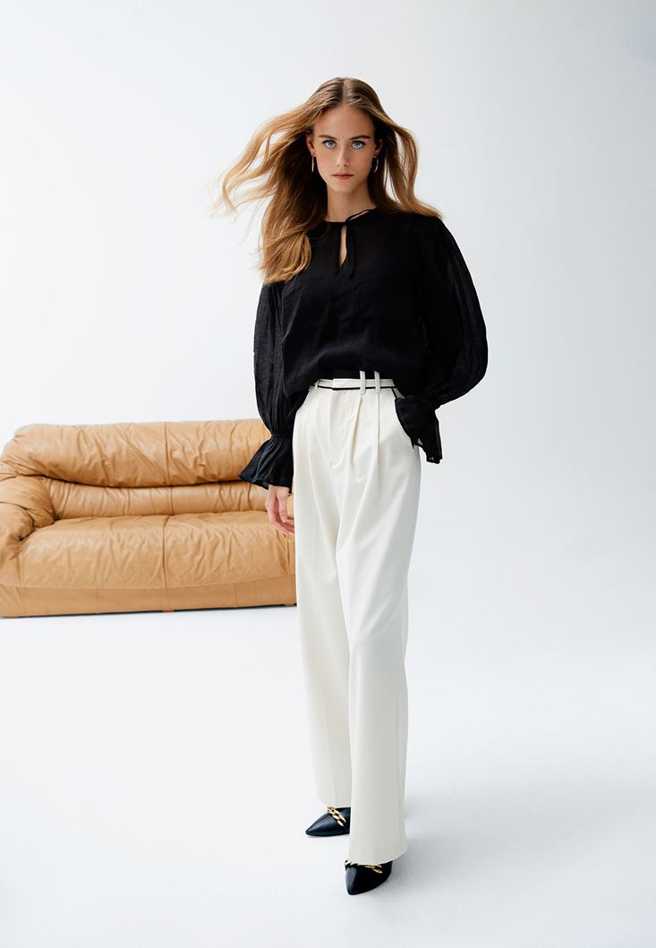 Viskon karışımlı doku, yüksek bel, bedenden uzak rahat fit, bol paça, ön kısmı pileli, iki cepli.