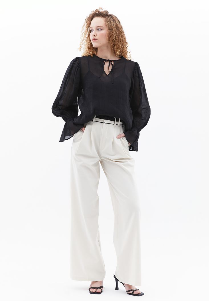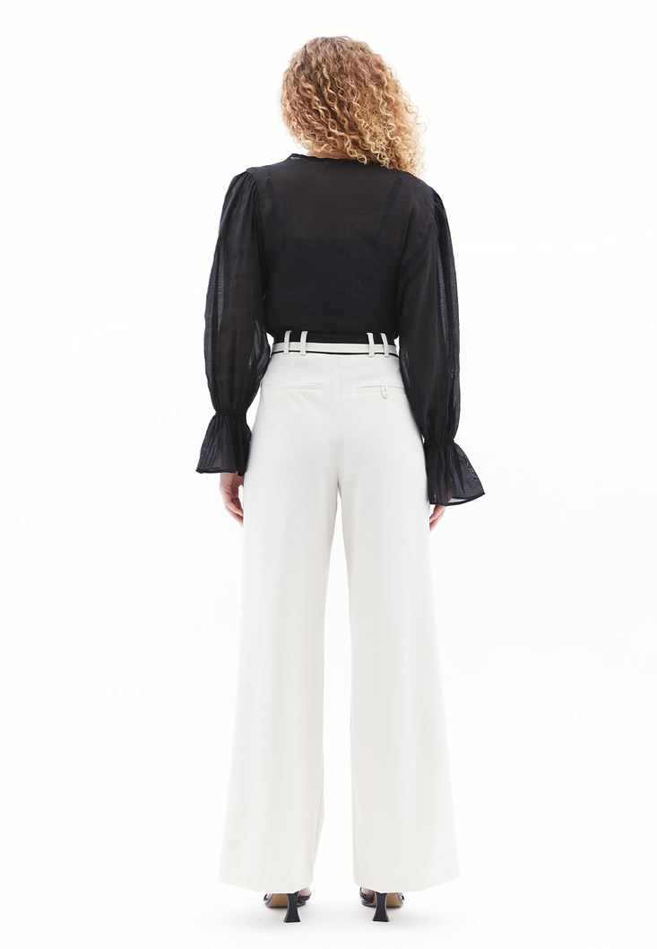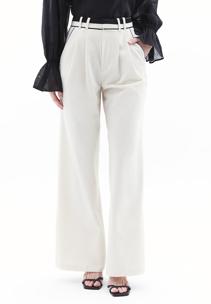 Krem Yüksek Bel Wide-Leg Pantolon